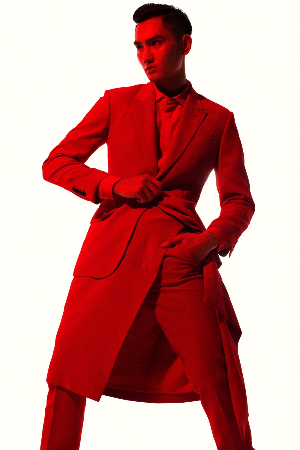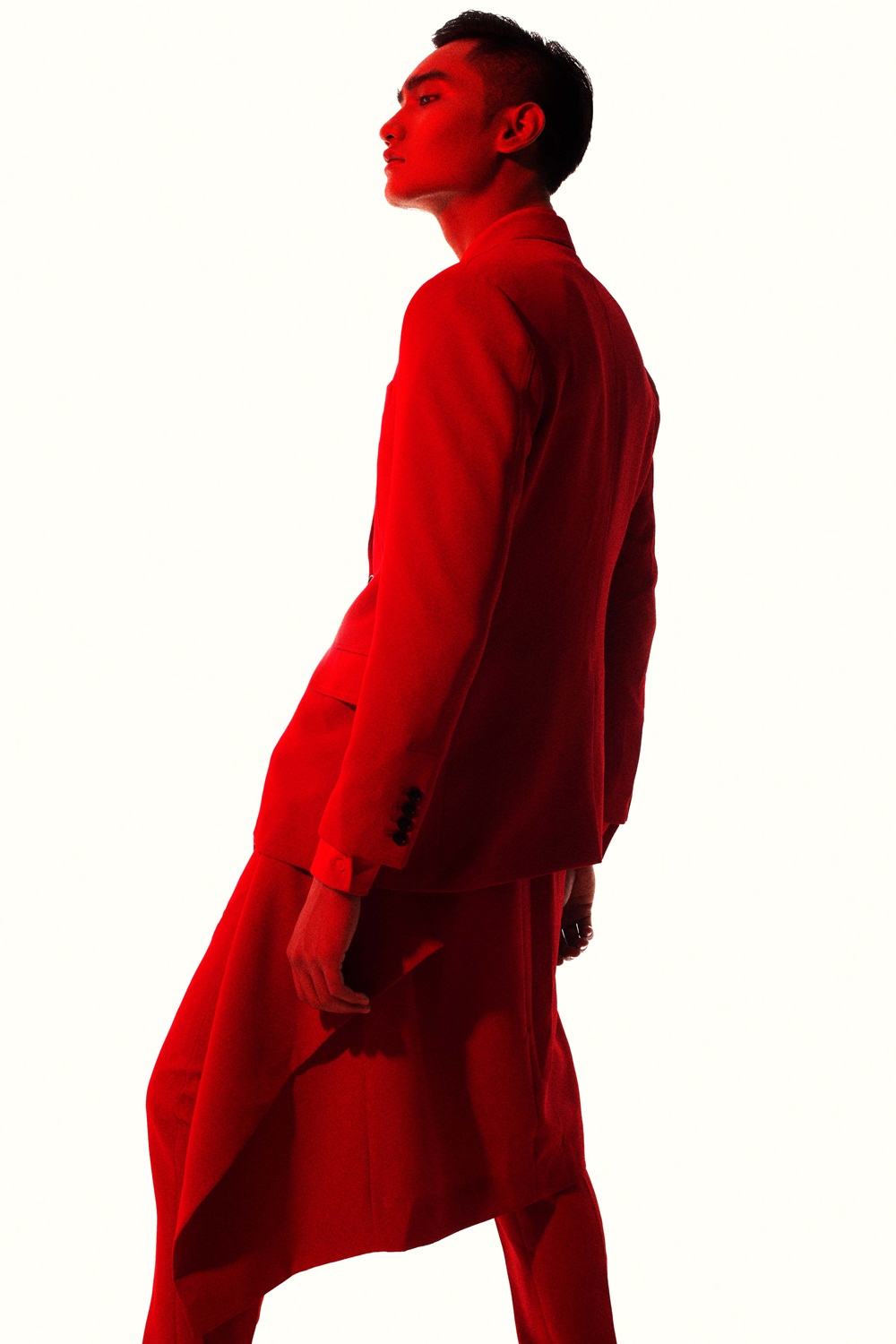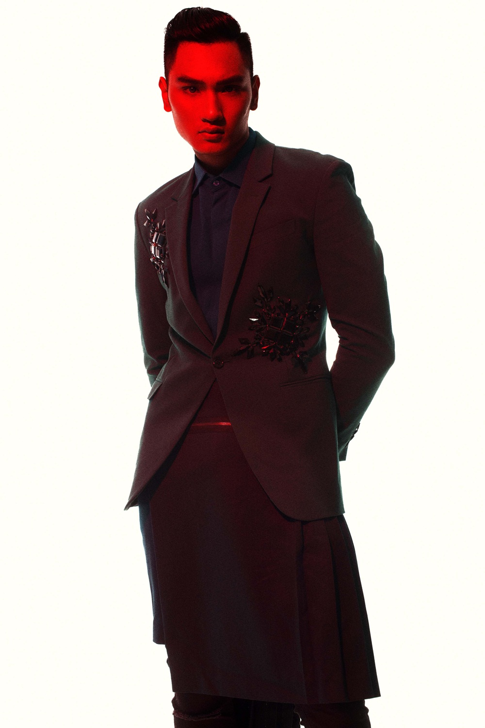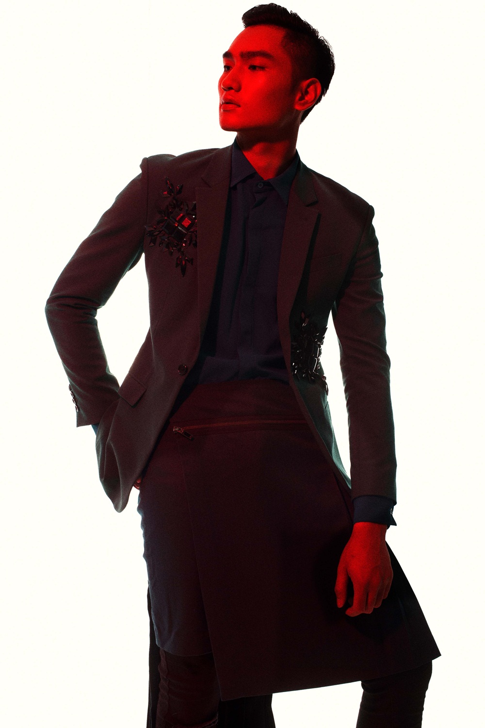 Những đường cắt bất đối xứng kết hợp cách phối trang phục nhiều lớp giúp Huy Quang trở nên mới lạ hơn khi diện suit cổ điển.