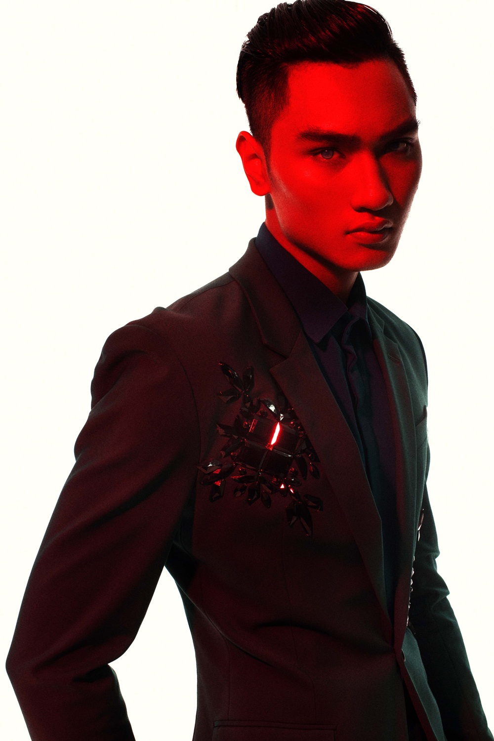 Vẻ đẹp nam tính, mạnh mẽ của Huy Quang được khai thác triệt để qua những đường cắt dứt khoát, mạnh mẽ, phom dáng đơn giản