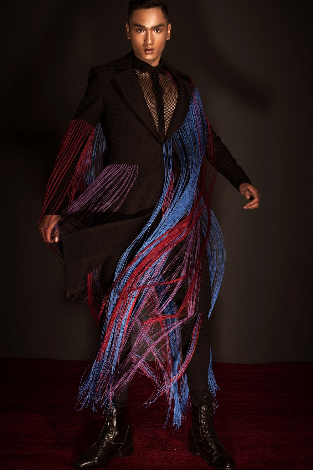 Chàng mẫu 9X sở hữu chiều cao khủng 1m88, thân hình cân đối, đôi chân dài bên cạnh gương mặt quá đỗi thu hút. Diện trang phục có chi tiết tua rua màu sắc mềm mại nhưng Huy Quang vẫn toát lên sự mạnh mẽ, lịch thiệp vốn có của người đàn ông trưởng thành. Đây cũng là điểm thú vị trong thiết kế của Đỗ Mạnh Cường khi giúp người mặc vẫn nam tính dù được khai thác theo hướng unisex.