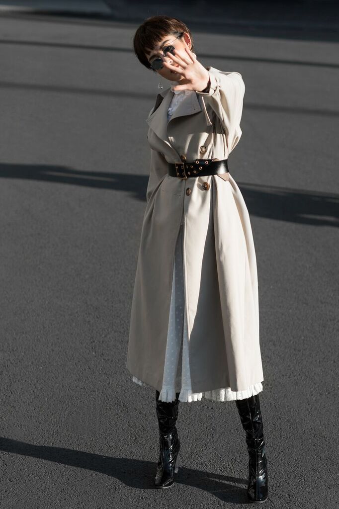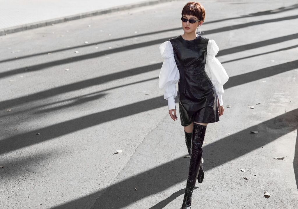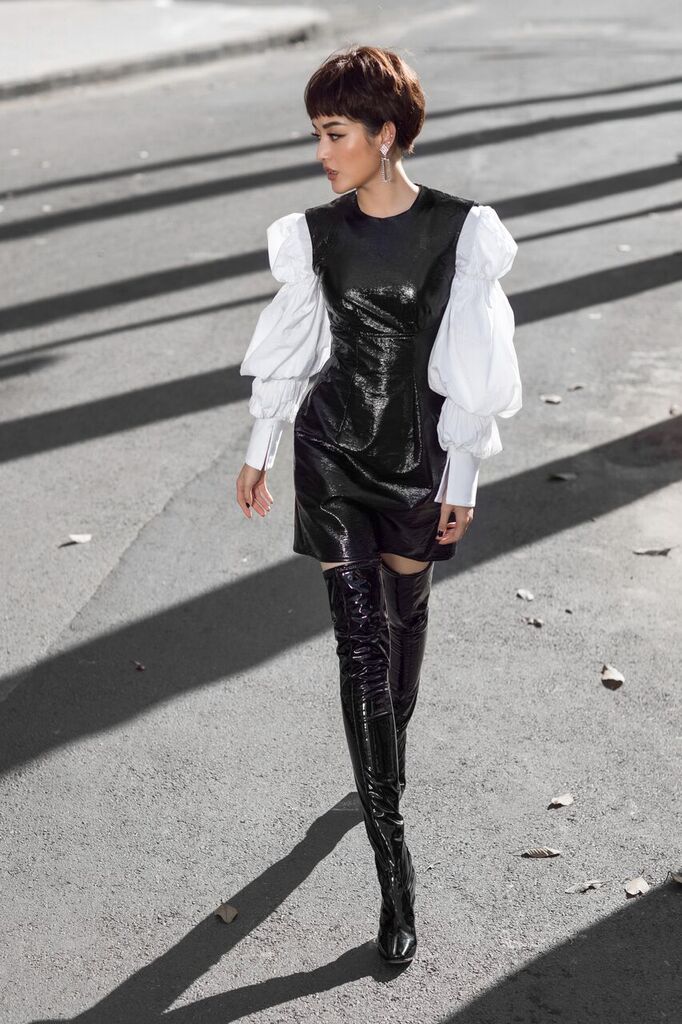 Với mái tóc ngắn cá tính, Huyền My nổi bật trên phố với bộ váy da bóng dáng chữ A, phối cùng áo sơ-mi trắng tay phồng và boots da quá đầu gối.