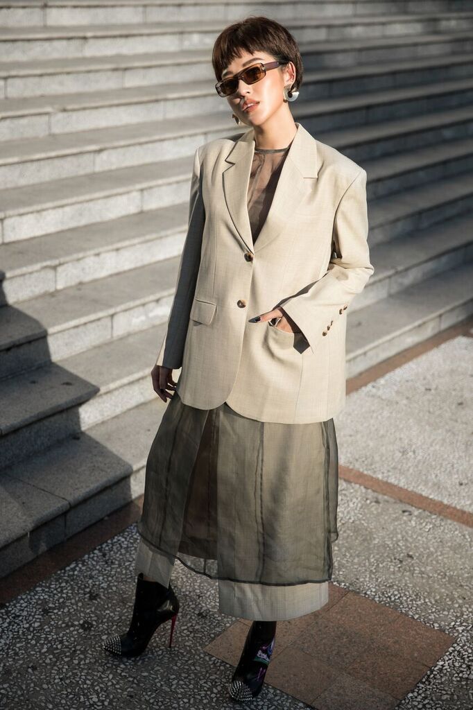 Điểm nhấn của bộ ảnh lần này chính là set đồ cá tính phối giữa chân váy voan xuyên thấu và áo vest oversize mà các tín đồ thời trang thế giới đang ưa chuộng trong những mùa mốt thu đông.