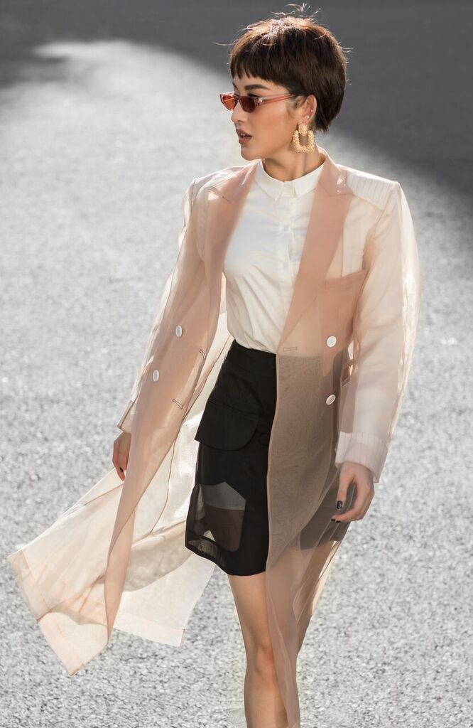 Phong cách áo choàng trong suốt cũng được Huyền My lăng-xê trong bộ ảnh lần này khi kết hợp cùng set đồ cơ bản là chân váy xuyên thấu màu đen và áo sơ-mi trắng.