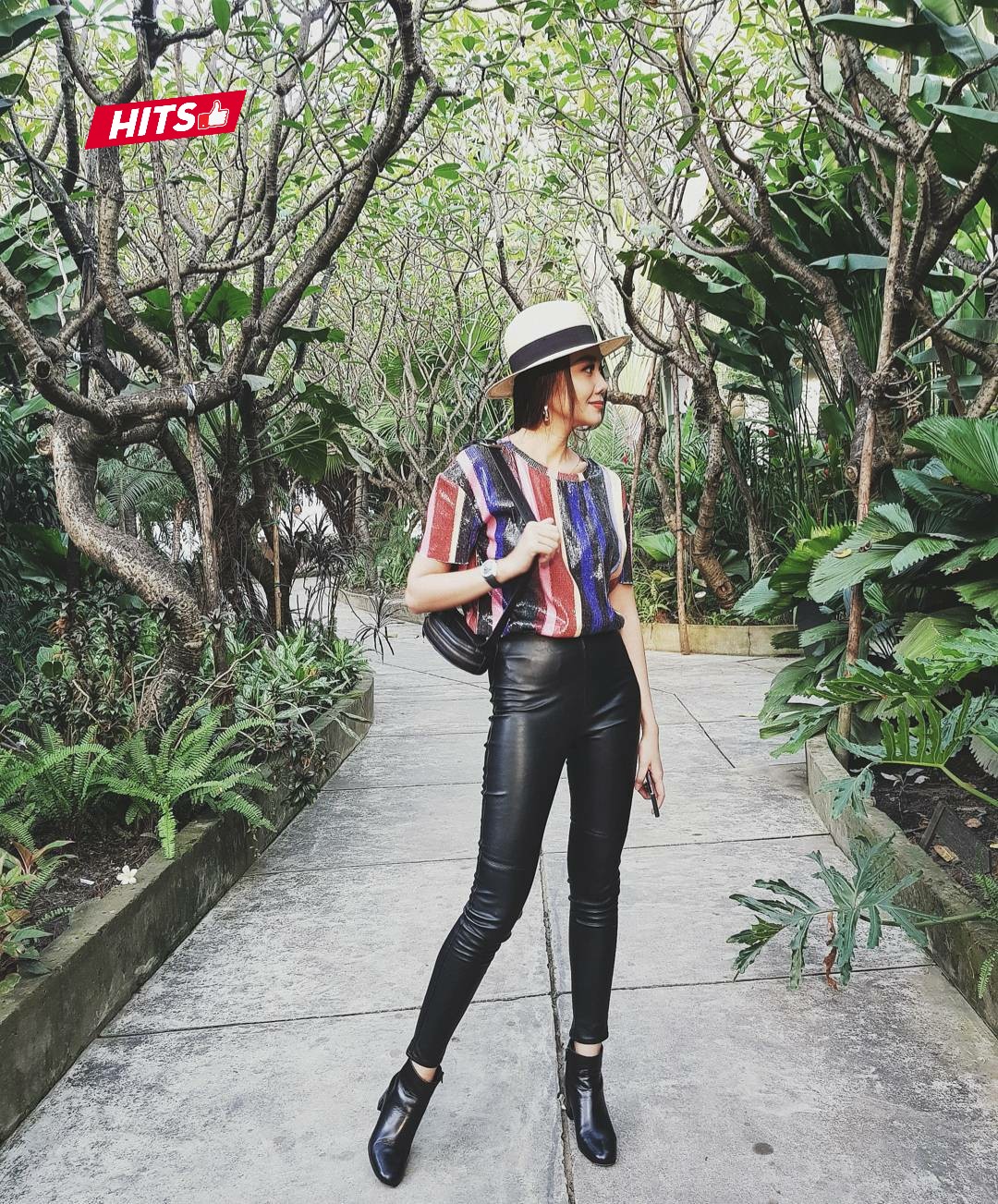 Giống với bạn thân, Thanh Hằng cũng khéo khoe đôi chân dài bất tận trong chiếc quần legging ôm chất liệu da. “Mẹ chồng” còn hoàn thiện outfit với áo freesize line sọc màu sắc, boots đen và mũ cói.