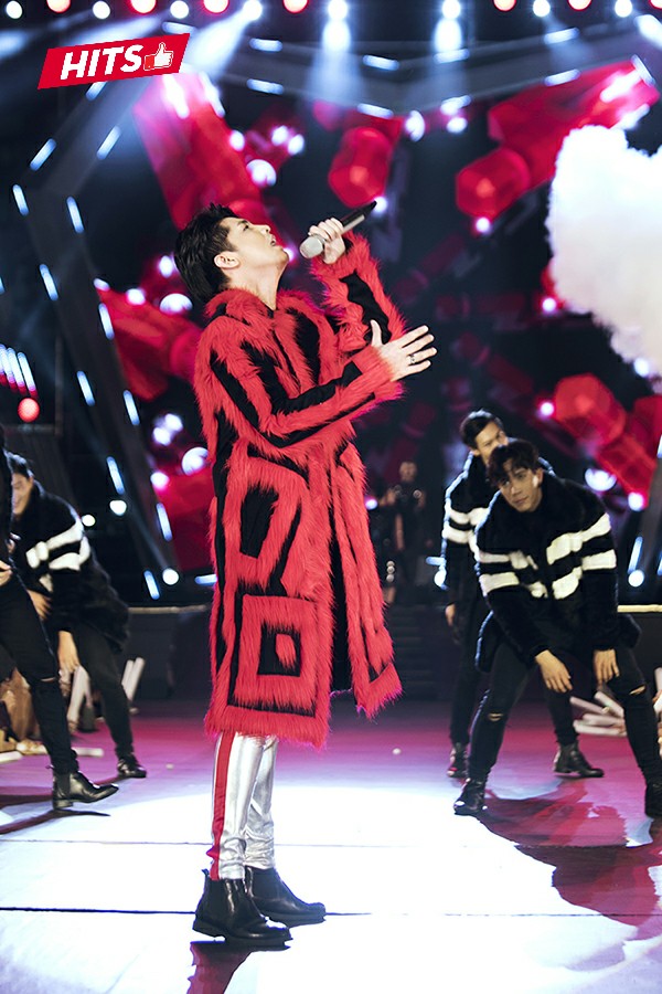 Noo Phước Thịnh cũng lựa chọn áo khoác dáng dài lông, họa tiết đỏ đen để cháy hết mình trên sân khấu. Nam ca sĩ thể hiện sự tinh tế trong gout thẩm mỹ khi quyết định phối kèm quần skinny ánh bạc, chi tiết line đỏ chạy dọc bên sườn giúp tăng chiều cao đáng kể.