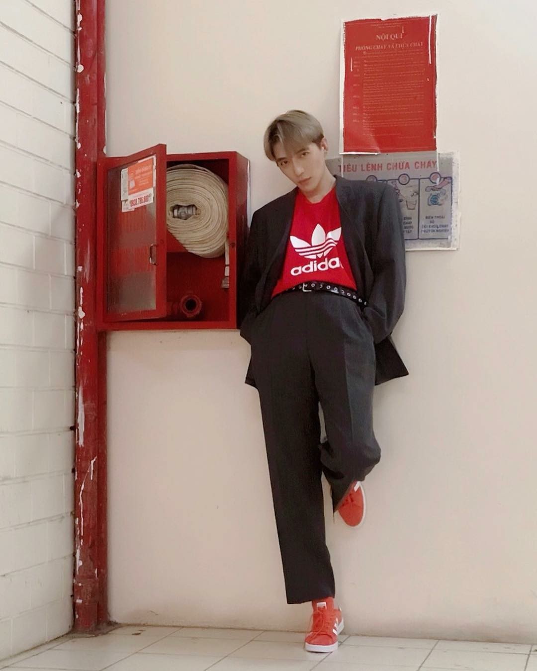 Mặc kệ đồng nghiệp chăm chỉ diện đồ của những nhãn hàng xa xỉ, nhạc sĩ Châu Đăng Khoa chỉ yêu thích thương hiệu bình dân Adidas. Set đồ full Adidas từ áo quần đến phụ kiện khiến cho chàng nhạc sĩ bản hit “Người lạ ơi” ngày càng “chất” nhưng không kém phần năng động.