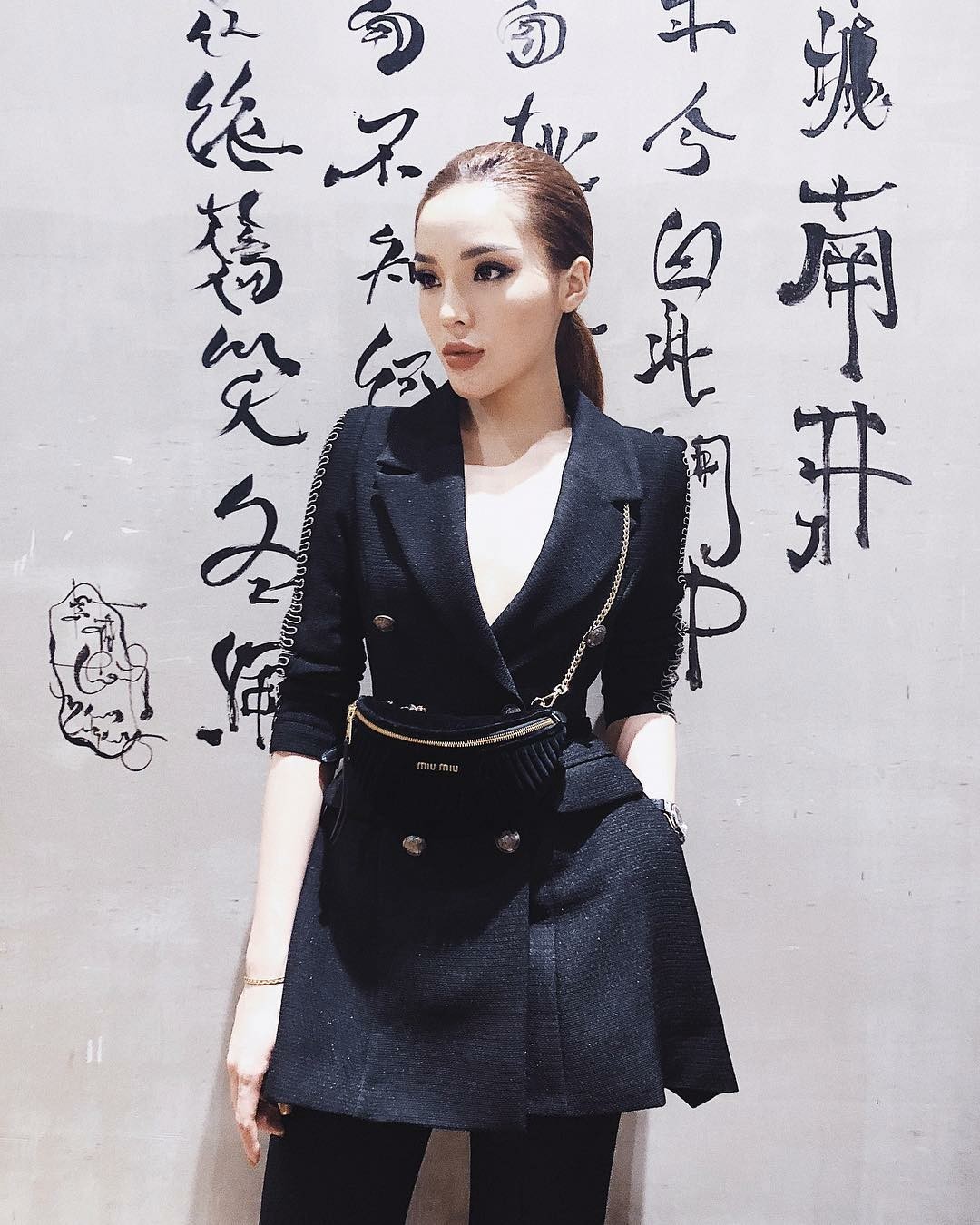 Kỳ Duyên đích thị là “chúa tể của những outfit đen” khi cô nàng gần như là fan cuồng của màu đen huyền bí. Chân dài diện vest đen kết hợp với tóc đuôi gà đơn giản cùng điểm nhấn là chiếc túi từ Miu Miu có form dáng lạ mắt.