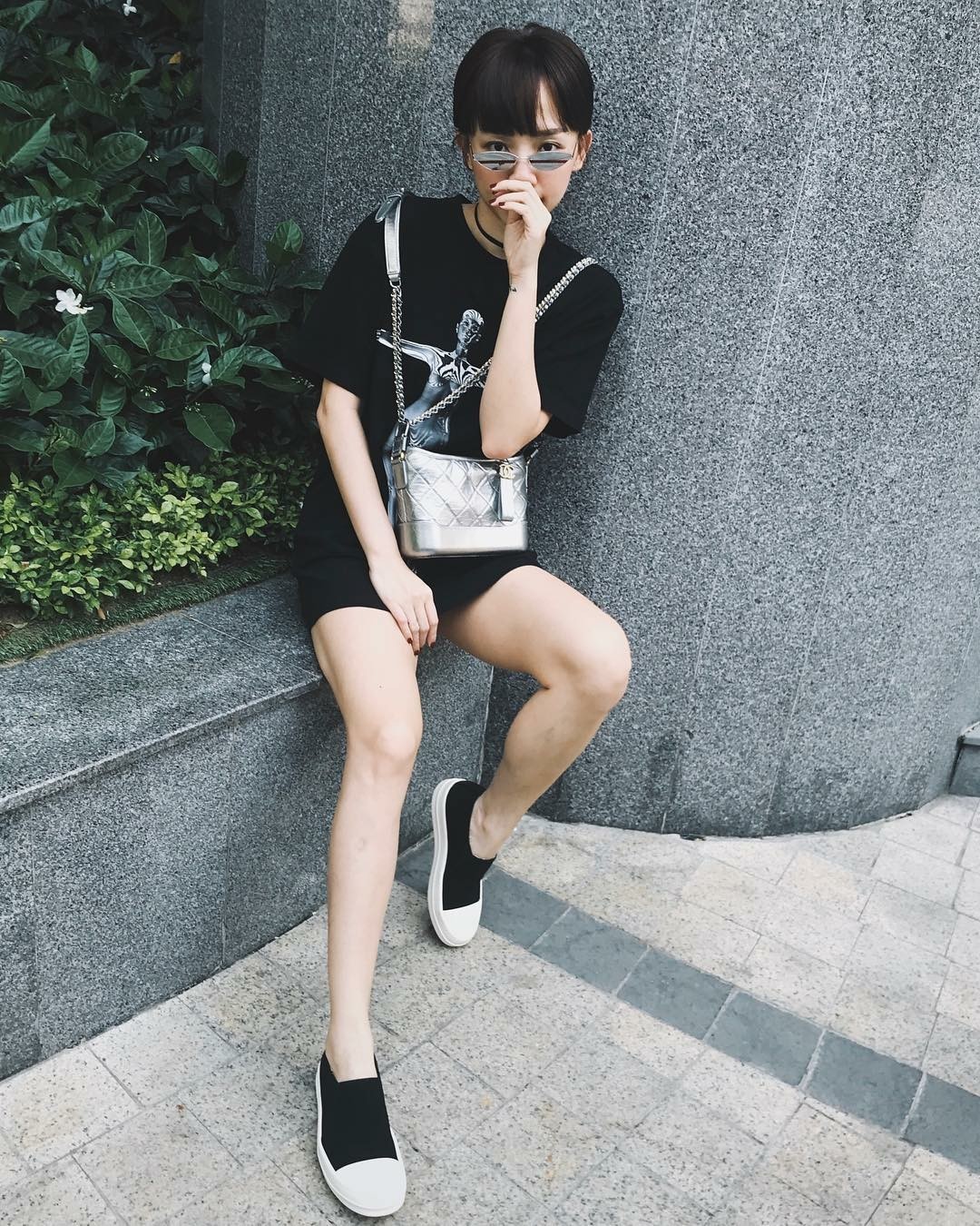 Không kém cạnh cô bạn thân Kỳ Duyên, hot girl Hà Lade chính là một trong những tay chơi đồ hiệu thứ thiệt. Người đẹp diện chiếc váy mini đen kết hợp với túi đeo chéo Gucci đắt đỏ và đôi mules đính đá thủ công sang chảnh.