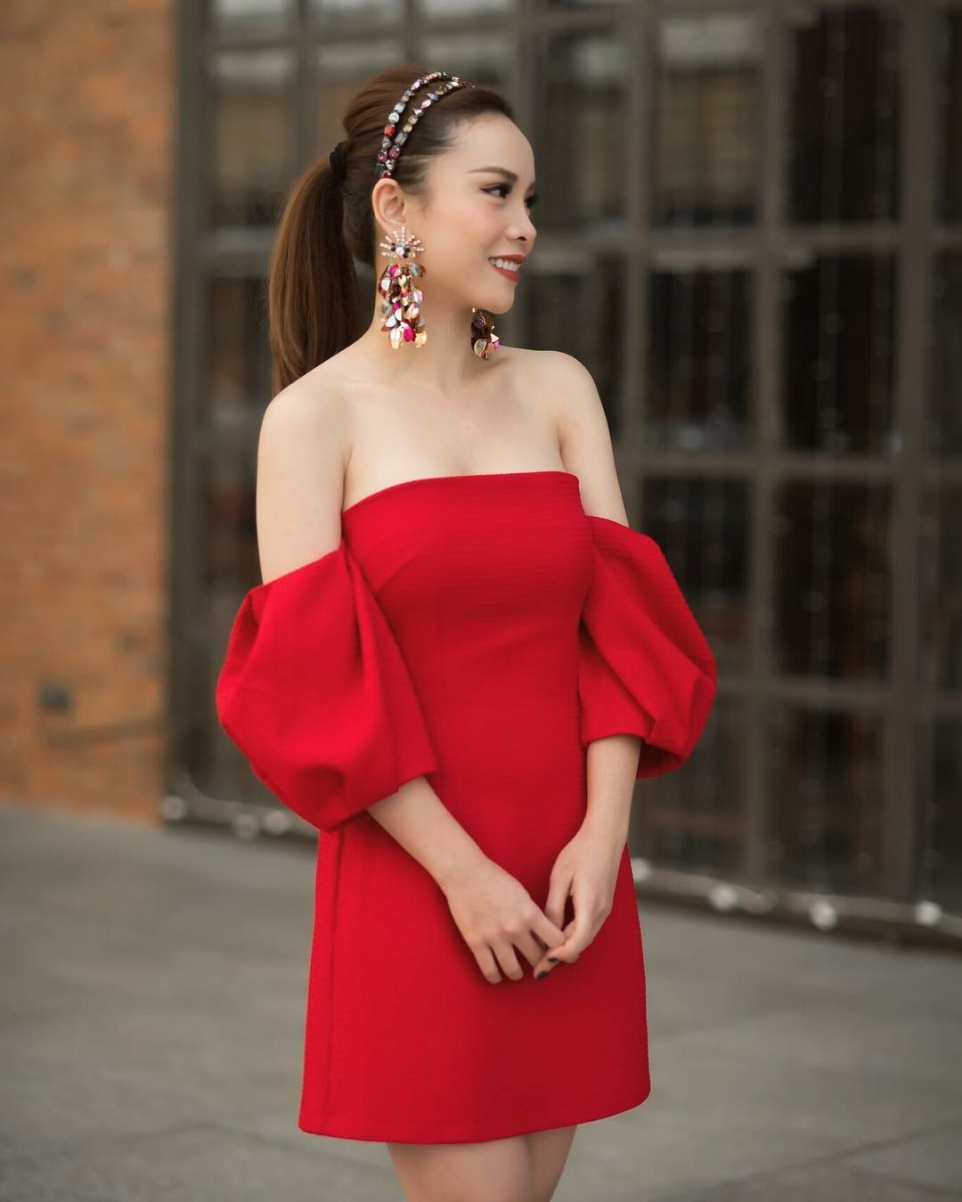 Yến Trang dịu dàng với váy đỏ đơn sắc được thiết kế khá đơn giản. Điểm nhấn trong outfit chính là cách Yến Trang chơi đùa trong màu sắc của phụ kiện để set đồ không còn nhàm chán, đơn điệu.