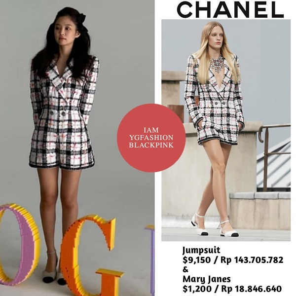 Loạt ảnh chụp hậu trường cho thấy, Jennie Black Pink vẫn trung thành với các items mang tính cổ điển của Chanel, điển hình là cô nàng diện nguyên cây Jumpsuit sọc ca rô có giá tầm 210 triệu đồng và đôi giày Mary Janes có giá tương đương 27 triệu đồng