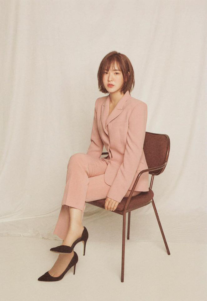 Wendy khác lạ hoàn toàn với mái tóc ngắn trong bộ suit hồng kín đáo như một nàng công sở