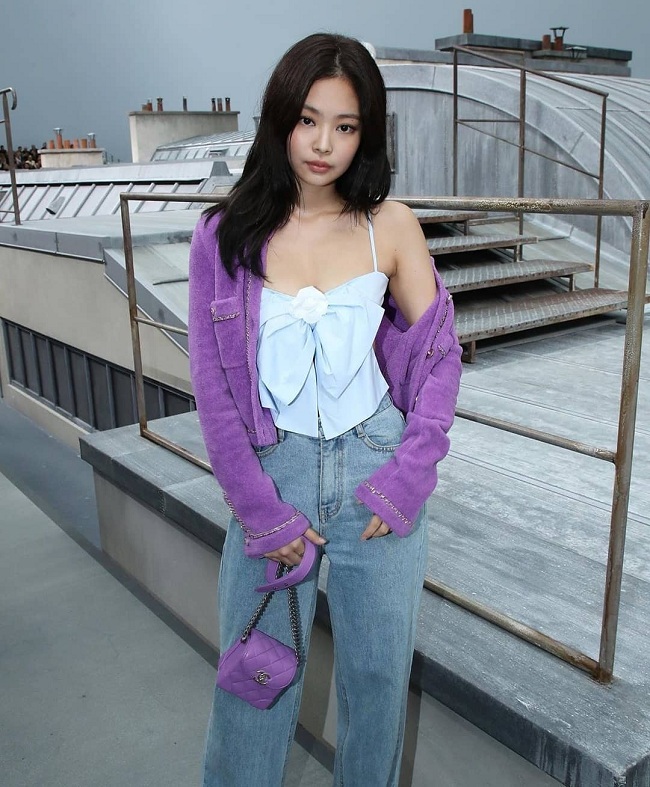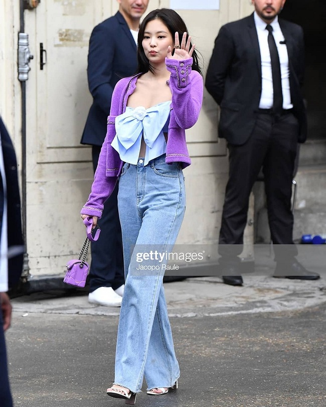 Jennie chọn nguyên set đồ đến từ nhà mốt Chanel với điểm nhấn chiếc áo hai dây màu xanh blue pastel lấp ló vòng 1 kết hợp với áo khoác tím cùng chiếc ví nhỏ xinh xuyệt tông