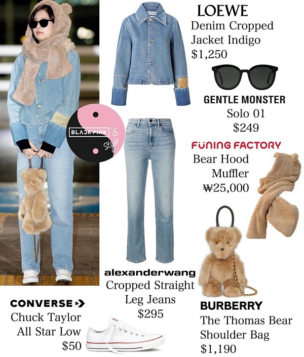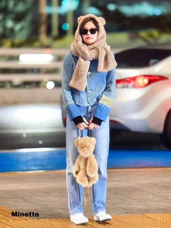 Xuất hiện tại sân bay Incheon vừa qua trong kiểu mũ “đầu gấu” vô cùng đáng yêu, Jennie Black Pink dường như tiếp tục tạo trend cho giới trẻ học hỏi theo trong set đồ jeans kín đáo khi mix cùng các phụ kiện teddy bear từ túi xách đến mũ đội giữ ấm.