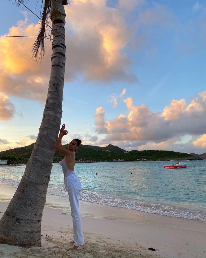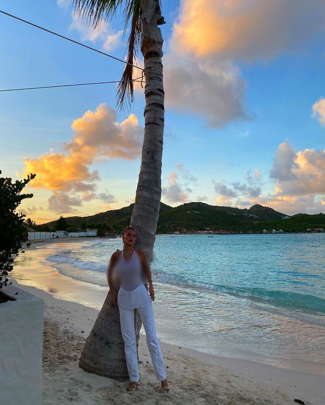 Chân dài Bella Hadid tạo dáng gợi cảm bên cây dừa trong áo yếm trắng mỏng manh lộ đầu ngực