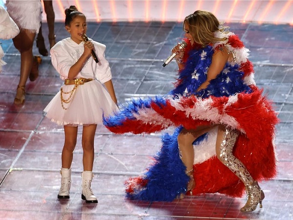 Khúc gần cuối chương trình, JLo còn choàng thêm cả áo lông vũ cờ Mỹ để tạo điểm nhấn