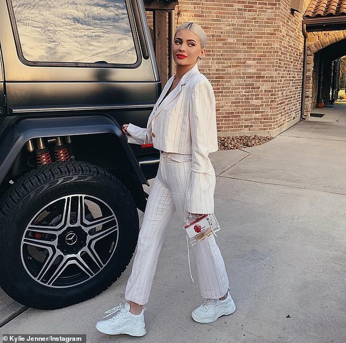 Kylie xinh đẹp với màu son nổi bật mang lại vẻ đẹp mặn mà, cô kết hợp giày sneakers big size cùng với chiếc túi phụ kiện trong suốt xinh xắn