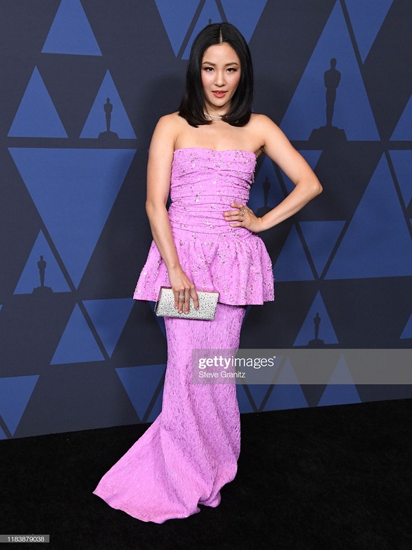 Nữ diễn viên trong phim “Crazy Rich Asians” trong chiếc váy cúp ngực nhún bèo phủ sắc tím pastel nữ tính đến từ Oscar De La Renta