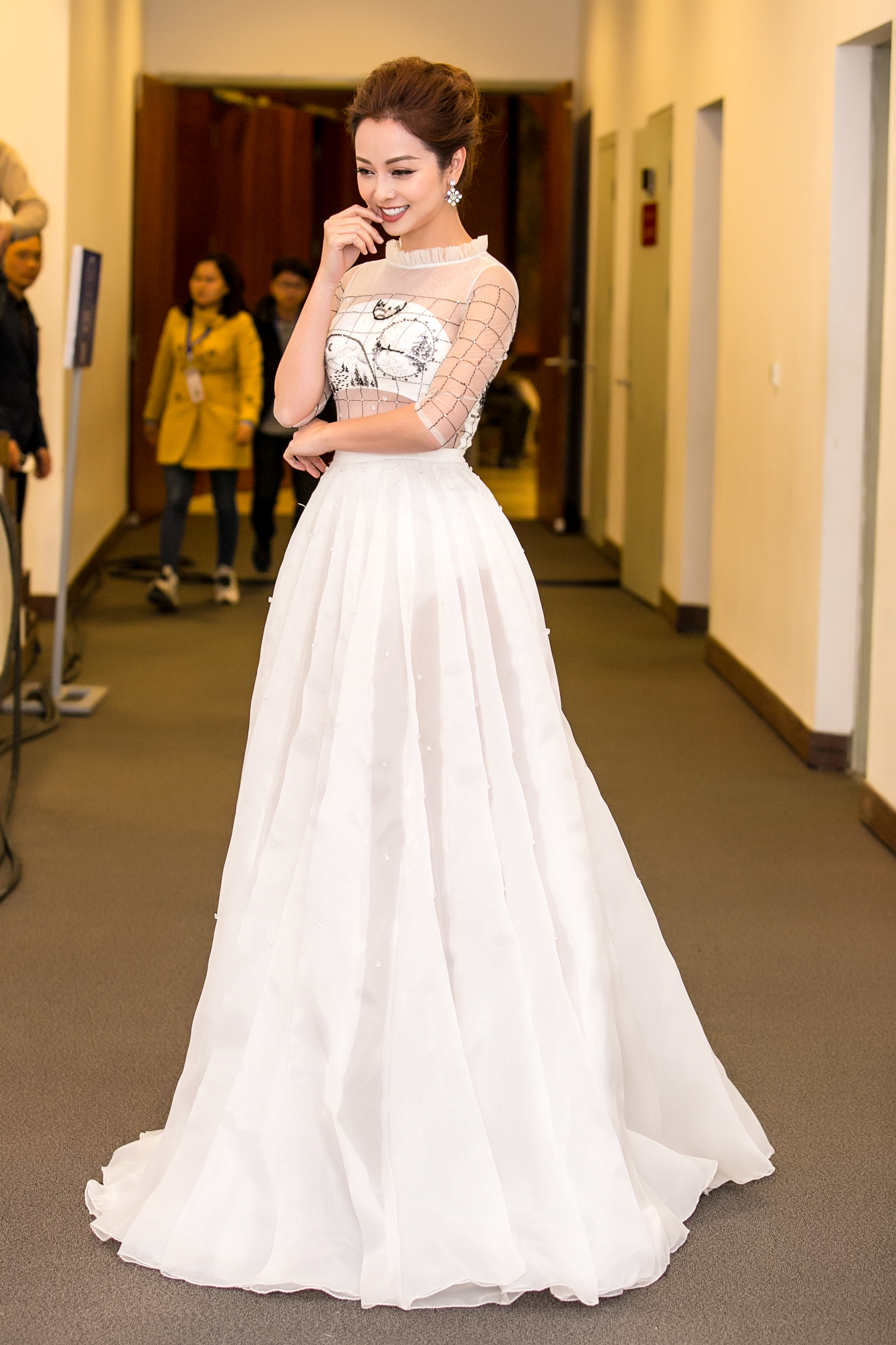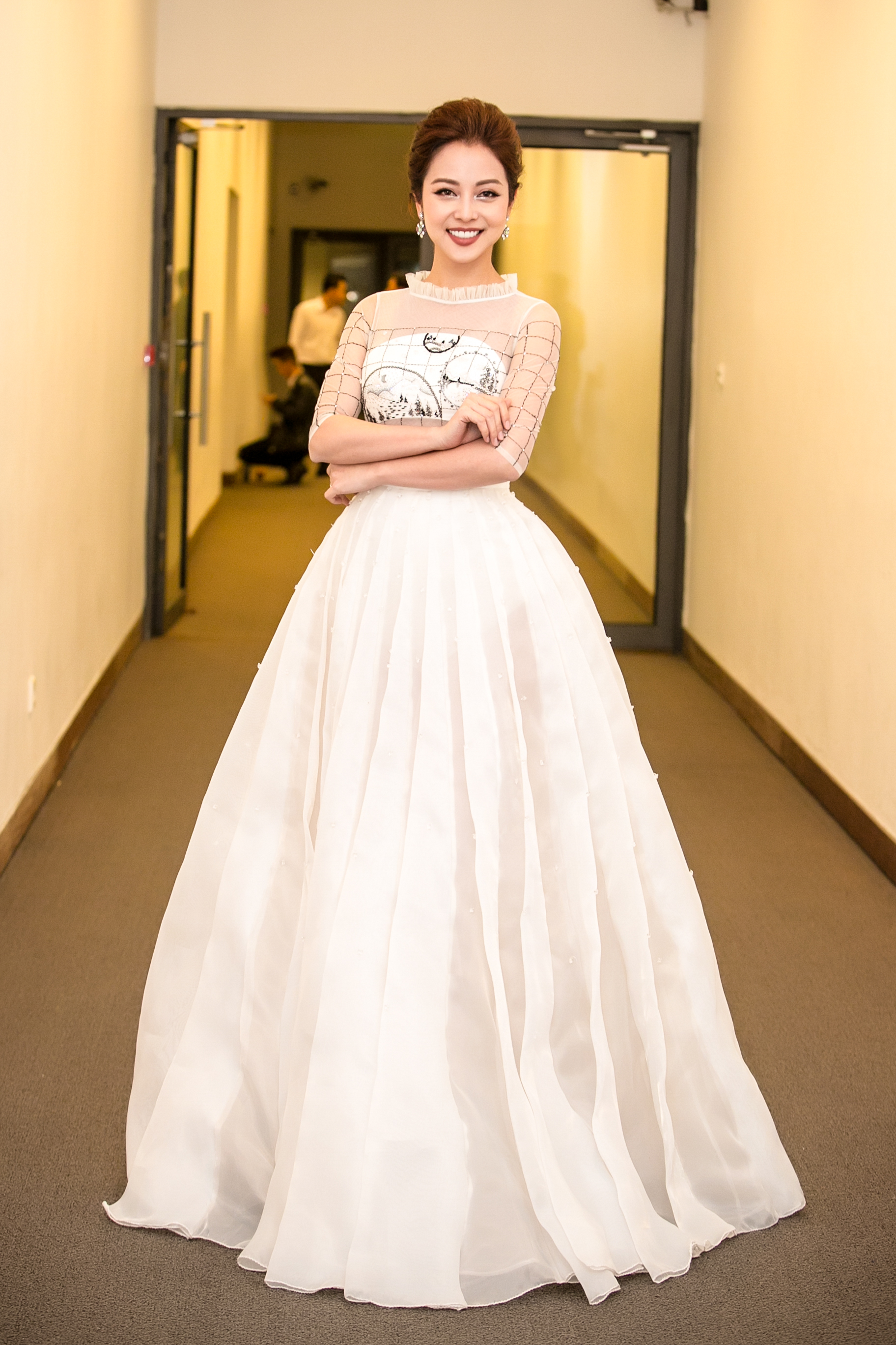 Như mọi khi, Jennifer Phạm chọn trang phục đầm dạ hội phong cách nữ tính, thanh lịch. Thiết kế tông trắng khá hợp vóc dáng người đẹp. Phần thân áo được thiết kế với chất liệu voan mỏng, phần vải che vòng 1 chỉ khoảng 1 găng tay nhằm tạo nét cuốn hút cho người mặc.