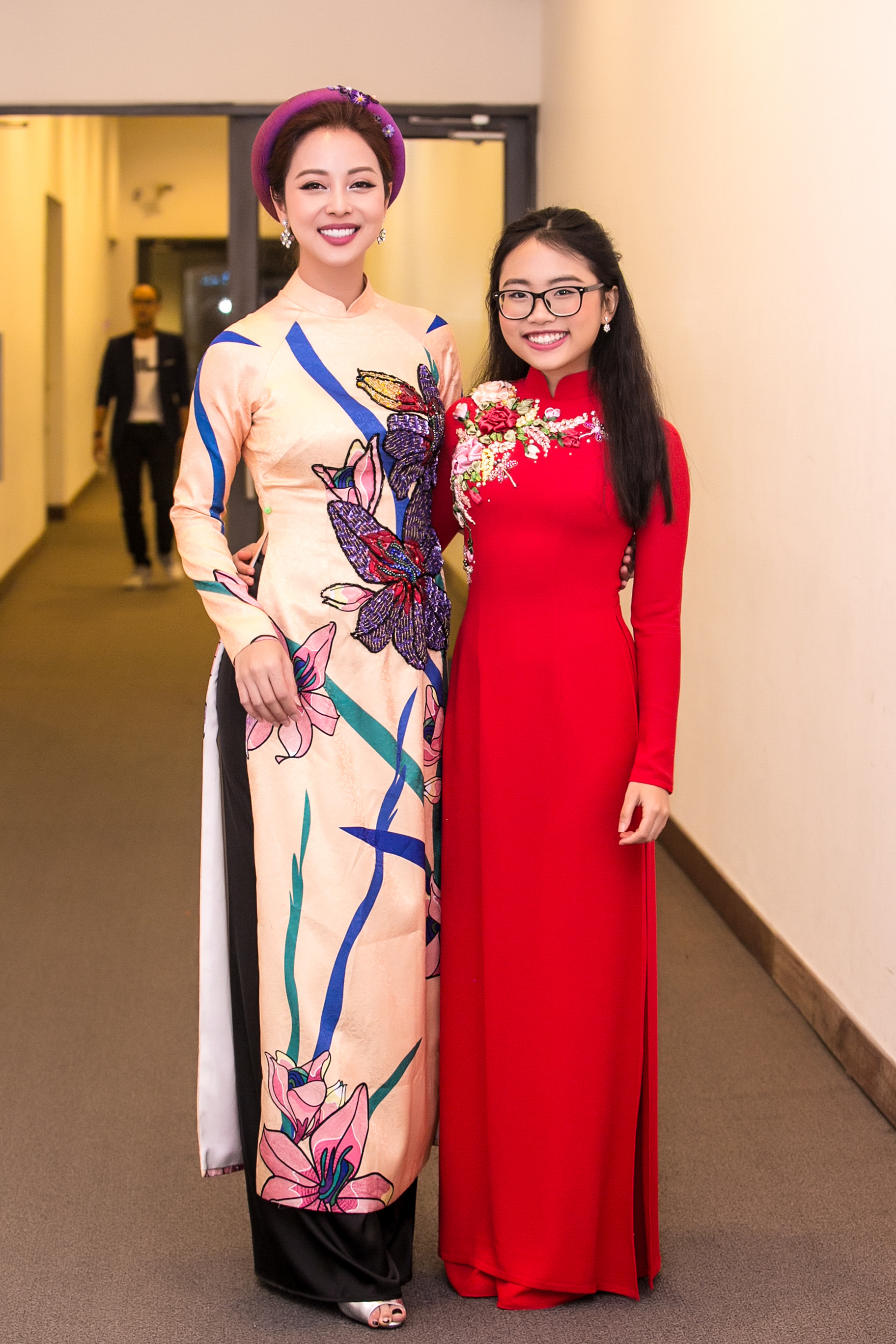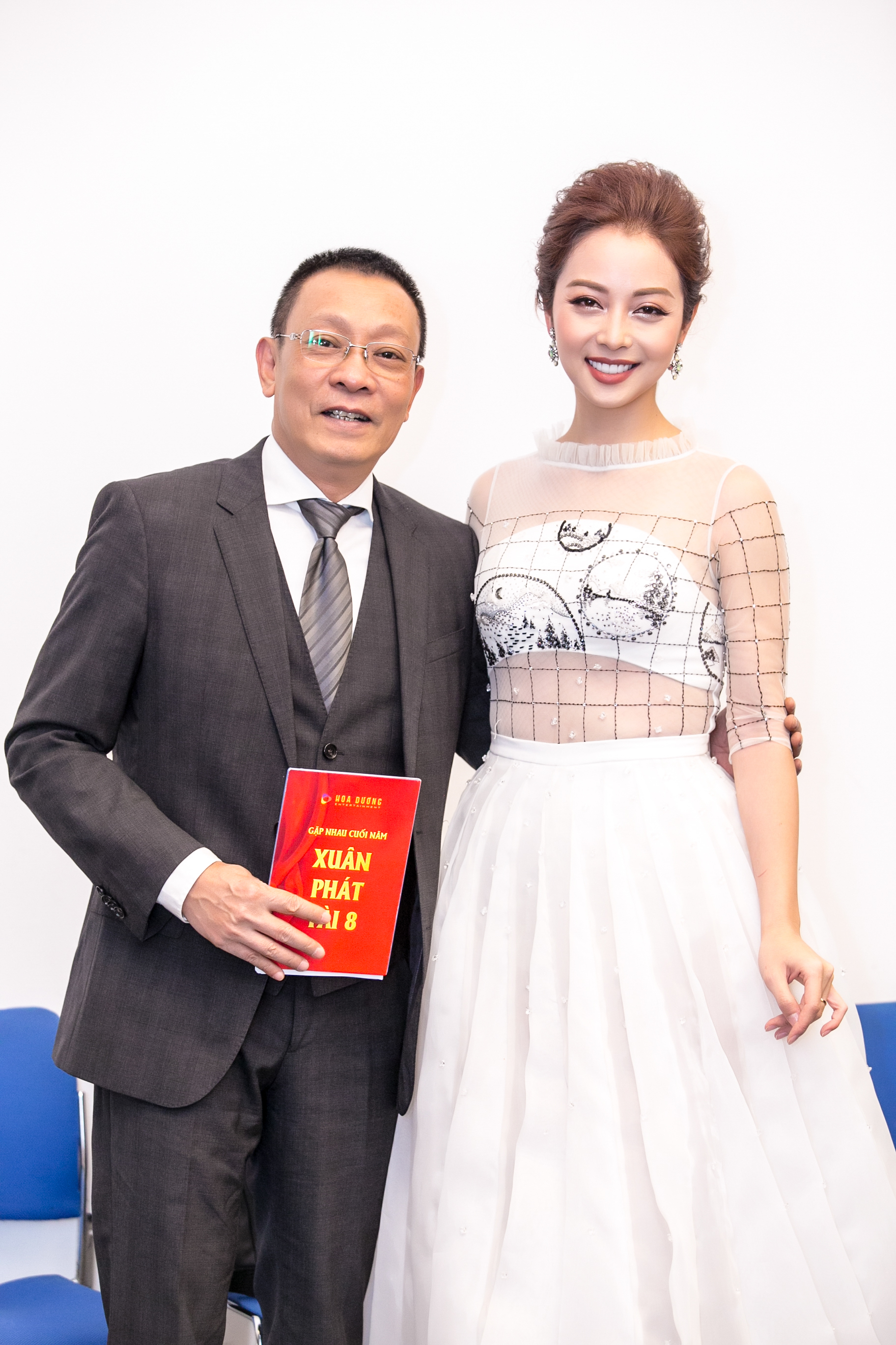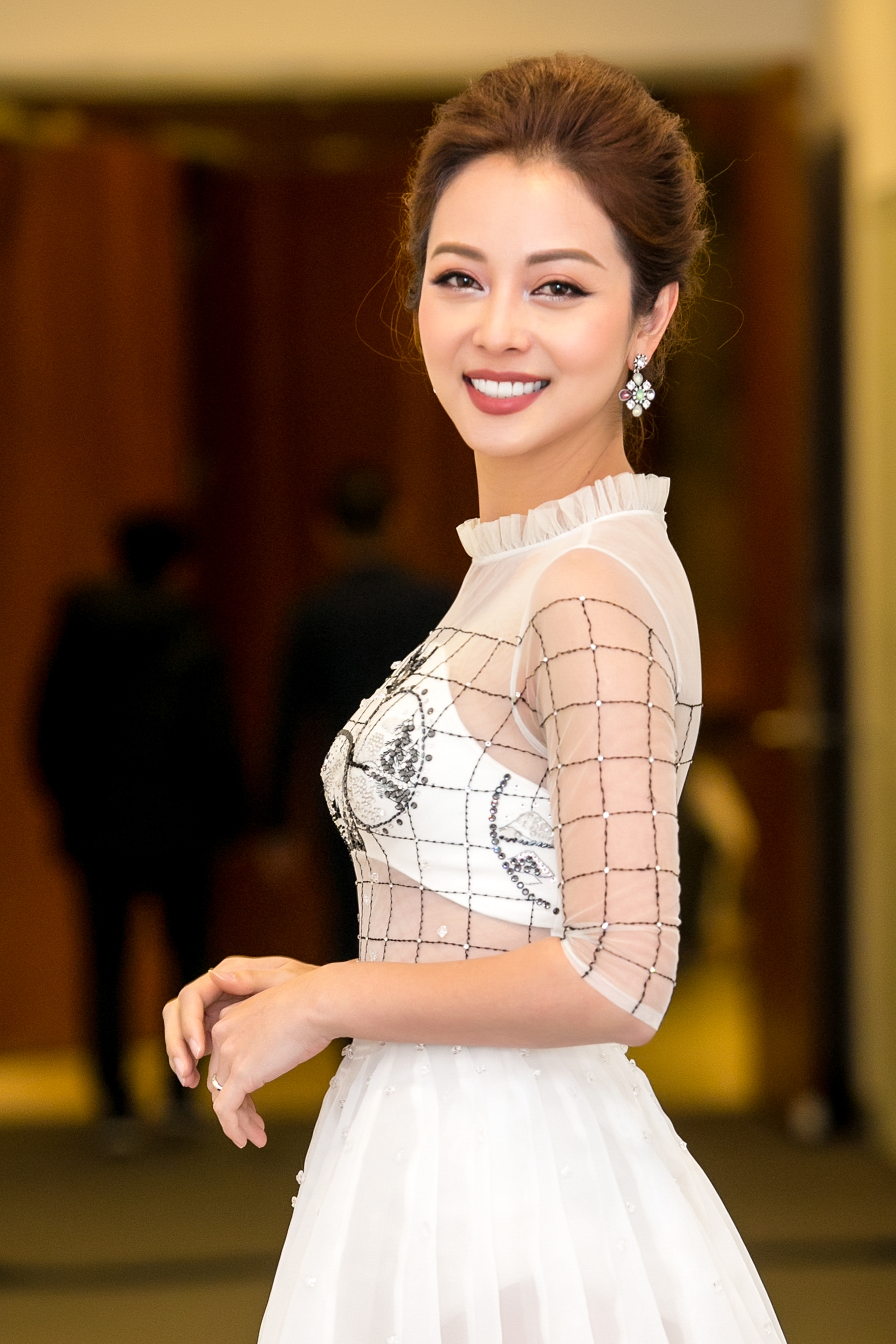 Tại sự kiện, hoa hậu hội ngộ MC Lại Văn Sâm. Trang phục phù hợp và tôn nhan sắc thu hút giúp Jennifer nổi bật và nhận được nhiều lời khen từ đàn anh.