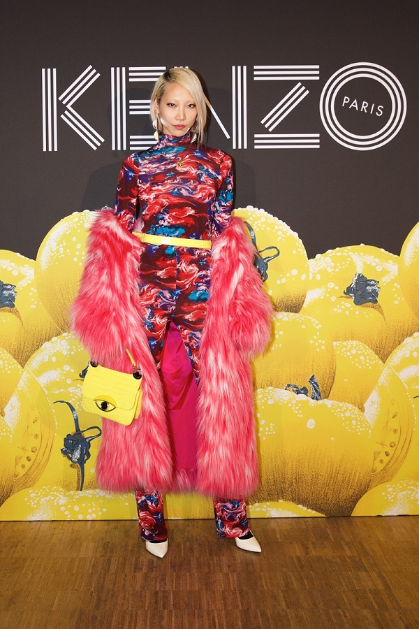 Siêu mẫu Hàn Park Soo Joo cá tinh với chiếc áo khoác lông màu hồng chủ đạo phối cùng túi xách màu vàng tạo nên bảng màu đa dạng