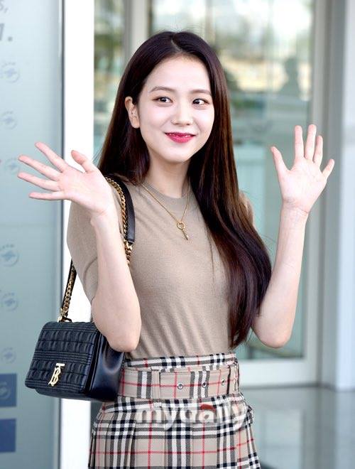 Ji Soo diện set đồ tông nâu của Burberry mix cùng túi xách đen cùng thương hiệu, rạng rỡ chào tạm biệt fan hâm mộ