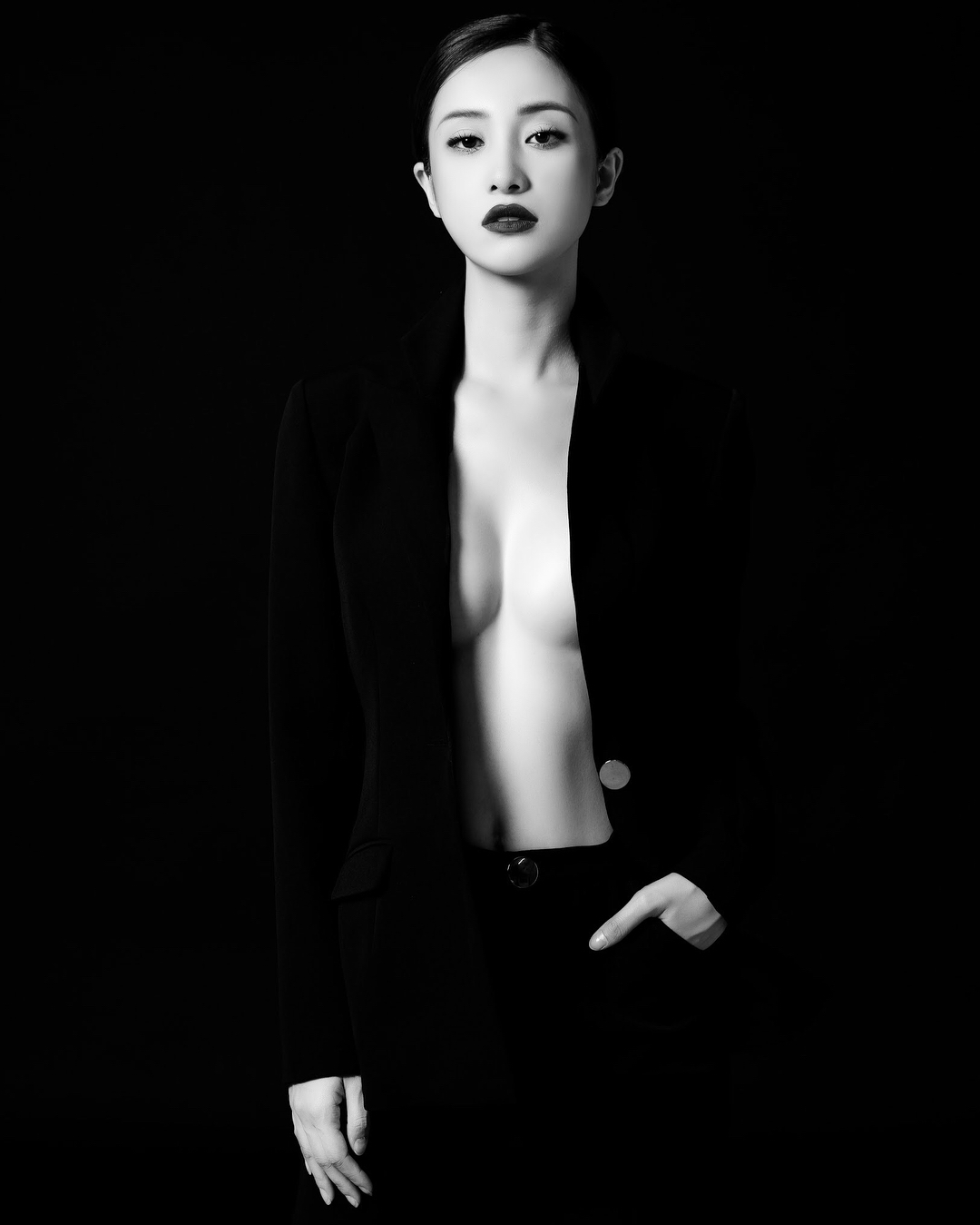 Cô nàng chụp cùng suit với gam đen trắng nhưng lại cực quyến rũ khi bung hết tất cả cúc áo khoe vòng 1 đẫy đà và vòng 2 săn chắc.