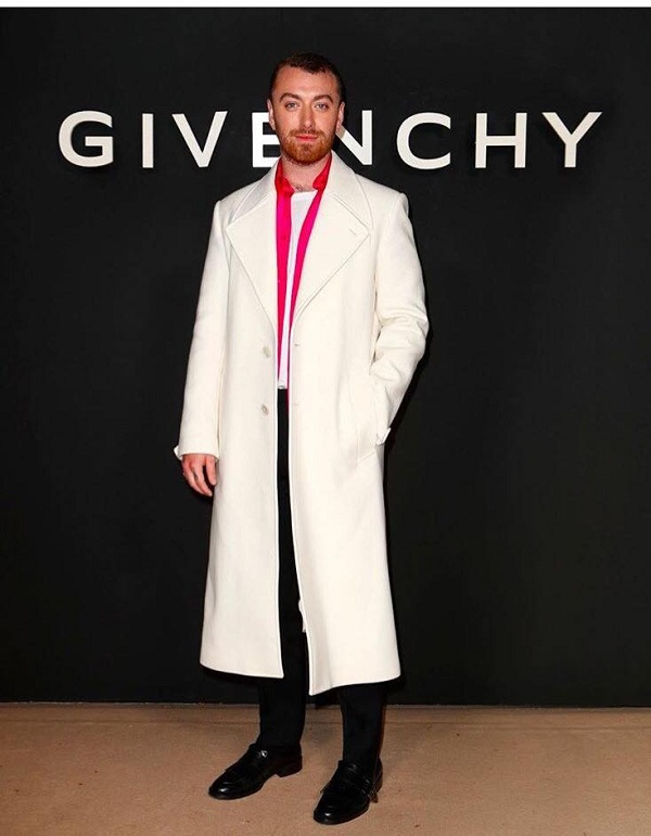 Ca sĩ Sam Smith trong thiết kế áo trench coat màu trắng dài thanh lịch tô điểm áo sơ mi hồng nổi bật ở bên trong