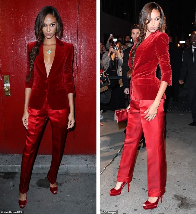 Thiên thần Joan Smalls nổi bật với áo vest da lộn “không nội y”, quần satin xếp li và giày cao gót xuyệt tông