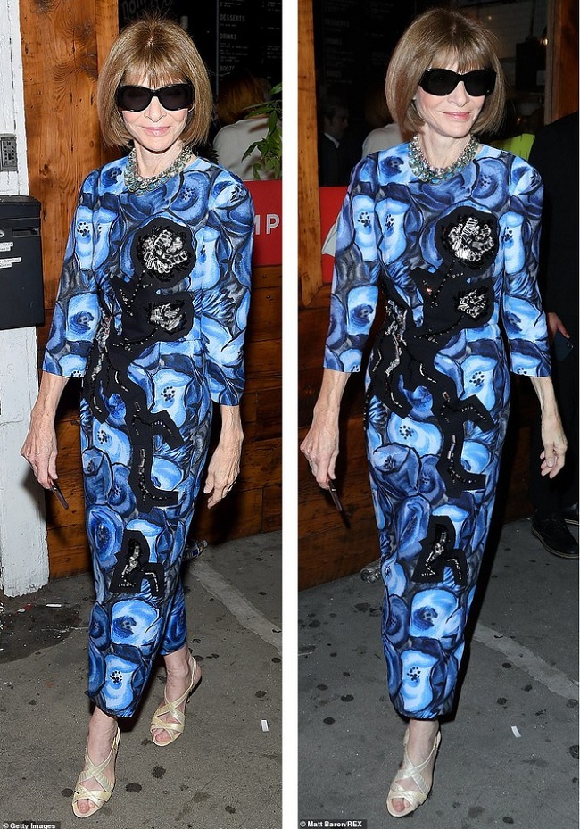 Người đàn bà quyền lực trong giới thời trang Vogue Anna Wintour sang trọng trong đầm dài hoạ tiết màu xanh kín đáo cùng cặp kiếng đen đặc trưng