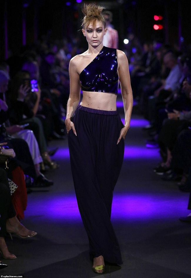 Gigi Hadid trình diễn set đồ gồm áo crop-top lệch vai ôm sát người làm từ chất liệu nhựa đúc và chân váy rộng màu tím, kết hợp giày cao gót xanh lá chuối . Tông makeup mắt đậm cùng kiểu tóc lạ mắt