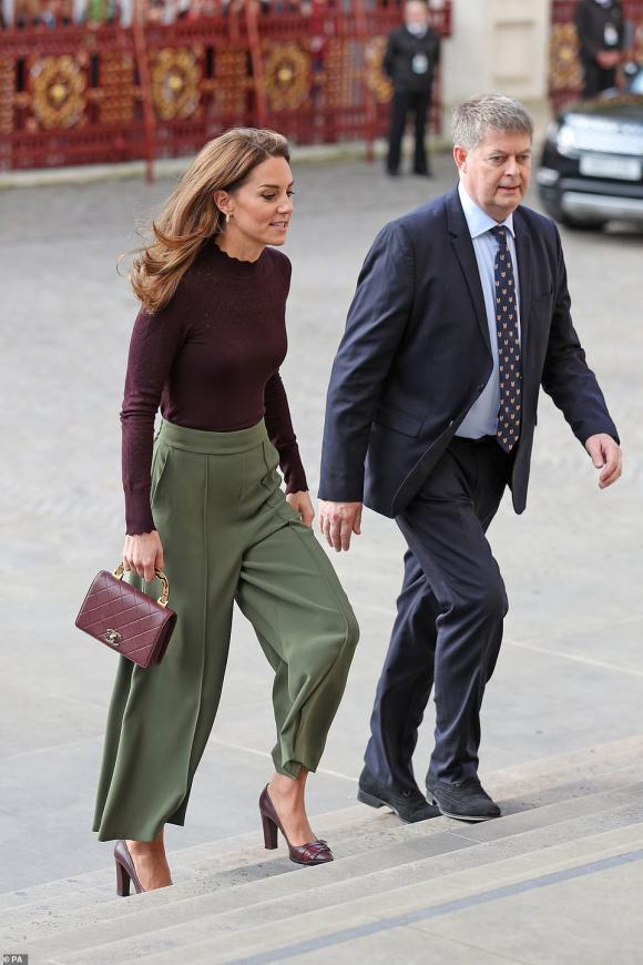 Nữ Công tước xứ Cambridge chọn phụ kiện túi Chanel và giày cao gót “xuyệt tông” với màu áo.