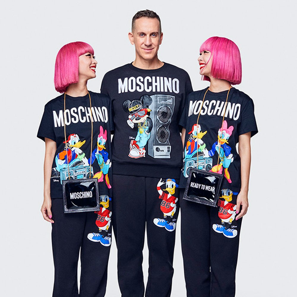NTK Jeremy Scott diện các thiết kế trong BST Moschino hợp tác với H&M chụp cùng đôi chị em fashionista nổi tiếng là Ami và Aya Suzuki.