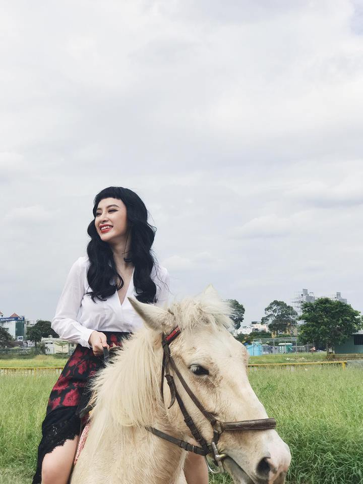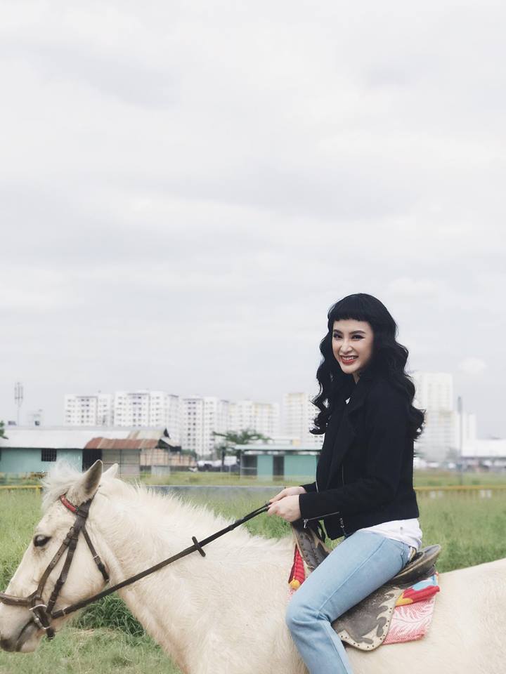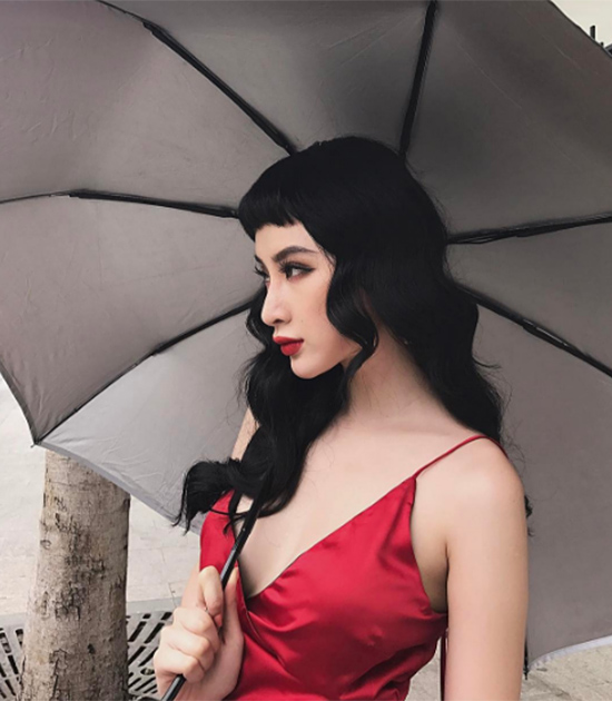Mới đây, “cô nàng lắm chiêu” đã không ngại thử nghiệm kiểu tóc mái ngang trán giống như icon MiMi cực kén mặt. Thực chất, kiểu tóc mái này không phải là mới nhưng kết hợp cùng tóc đen mượt mà uốn xoăn sóng như Angela Phương Trinh thì đây là lần đầu.
