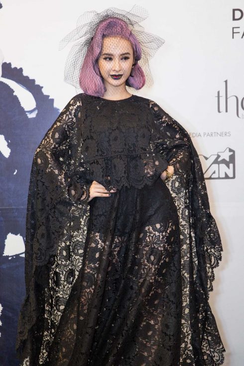 Tại Tuần lễ thời trang quốc tế Việt Nam Thu Đông, xuất hiện tại thảm đỏ, Angela Phương Trinh thu hút ống kính với lối trang điểm và kiểu tóc lạ lẫm pha chút ma mị