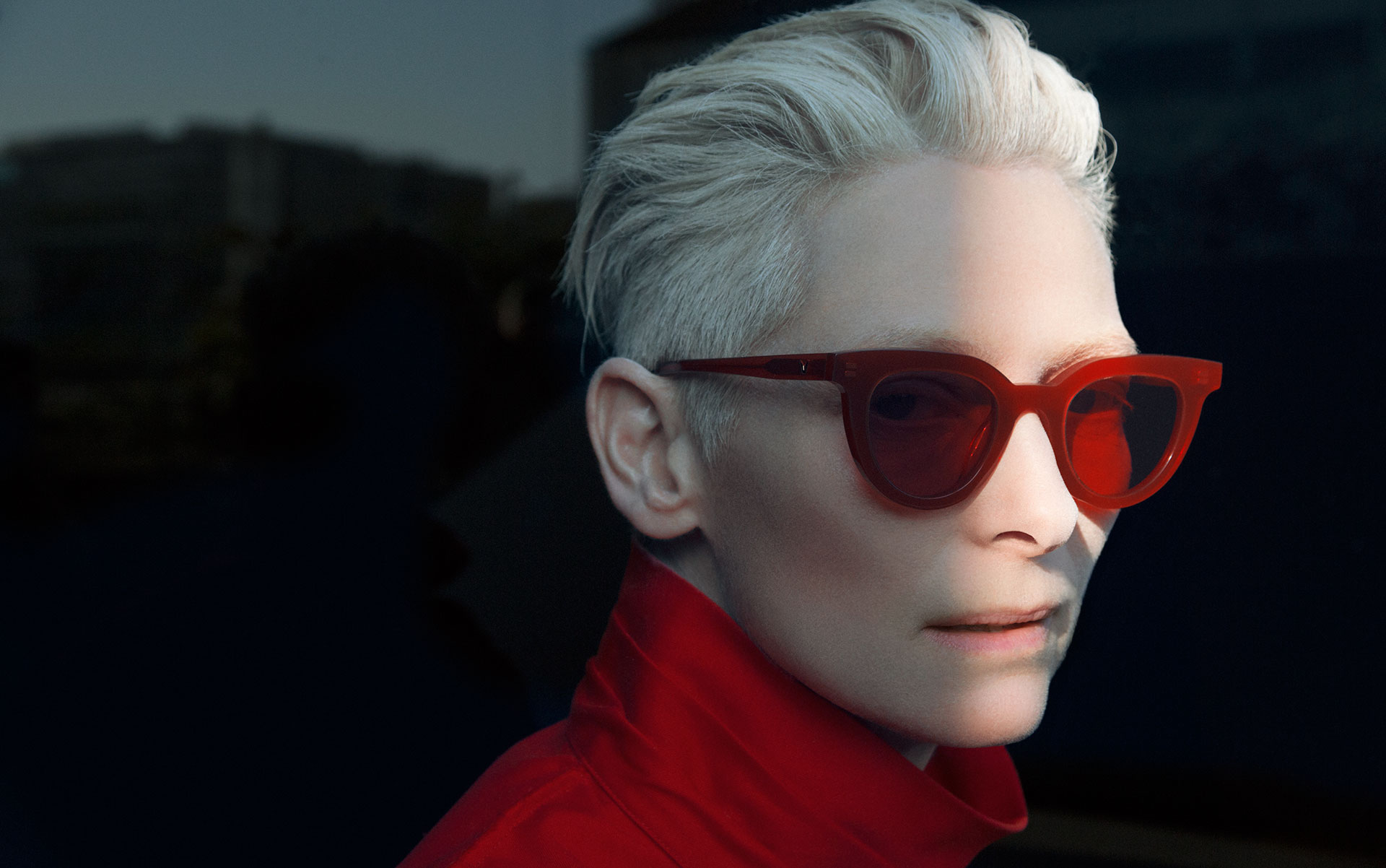 Tilda Swinton cùng chiếc mắt kính all red chụp mẫu vô cùng hút mắt.
