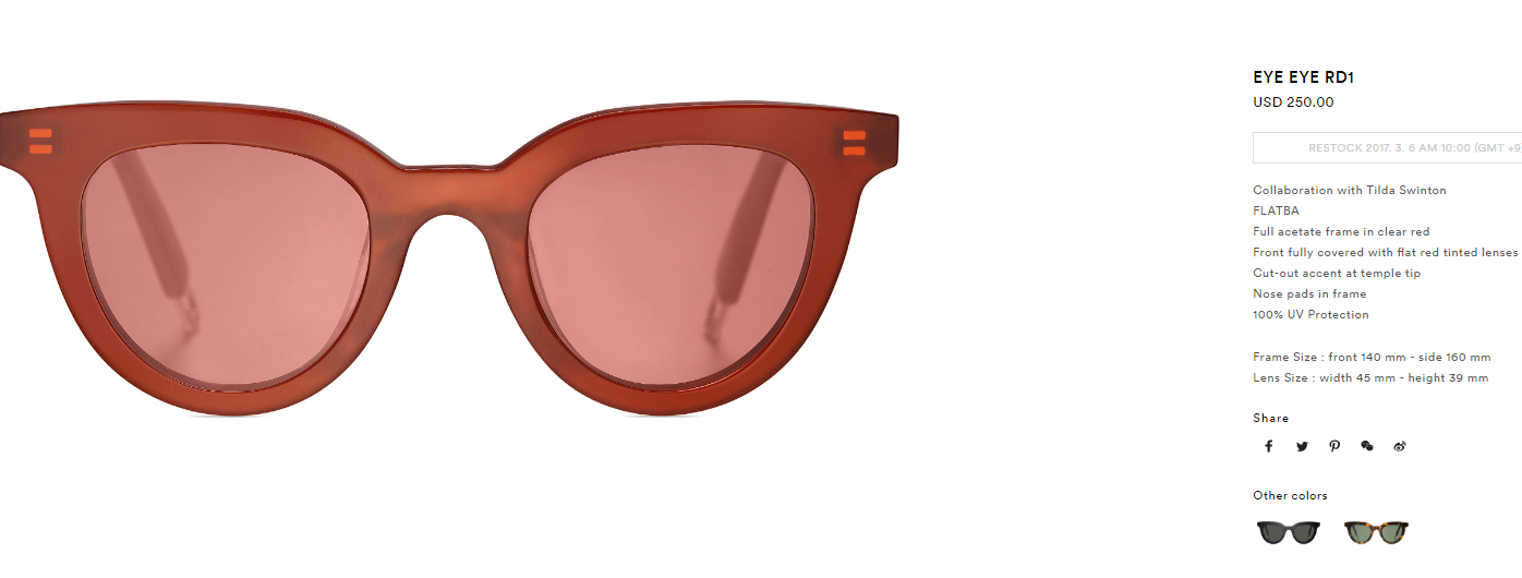 Chiếc mắt kính thời thượng này được kết hợp giữa nữ diễn viên điện ảnh Tilda Swinton, biểu tượng menswear của Anh Quốc, và thương hiệu mắt kính thời trang Hàn Quốc đang cực hot này. Được biết, giá bán lẻ của dòng mắt kính mới giao động từ 250 USD đến 286 USD.