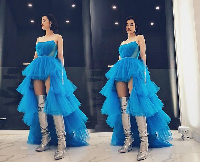Đông Nhi cũng ngay sau đó bắt trend nhanh với kiểu váy xếp tầng này với tông màu xanh biển phối cùng boots màu bạc