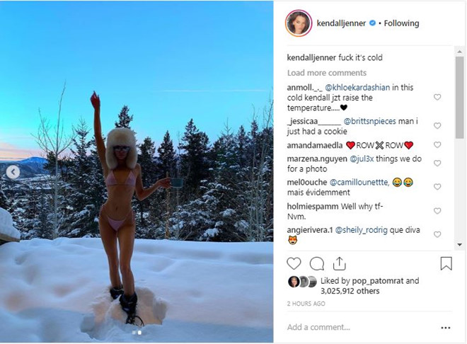 Nàng mẫu Kendall Jenner gây xôn xao cư dân mạng khi post ảnh trên trang cá nhân mặc bikini với tiêu chí “thời trang phang thời tiết” với bộ bikini màu hồng tím phối cùng mũ, mắt kiếng và giày boots trượt tuyết trong không gian cây cối và tuyết trắng xóa cả một vùng trời.