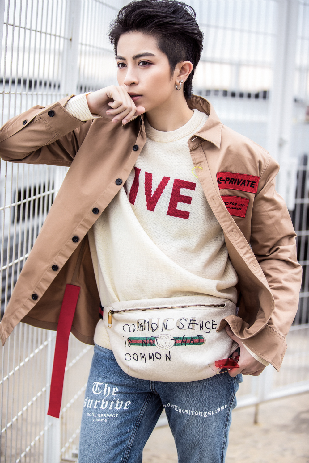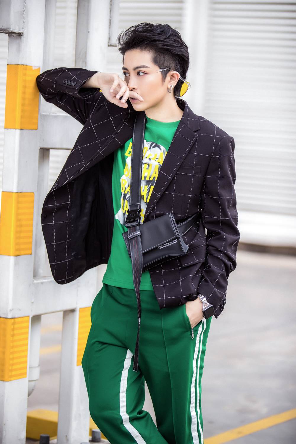 Quần thể thao màu đen và chiếc túi “bao tử” vòng quanh hông hoàn thiện phong cách vừa khỏe khoắn, vừa cá tính, phù hợp với những người yêu thích sự thoải mái, phóng khoáng.