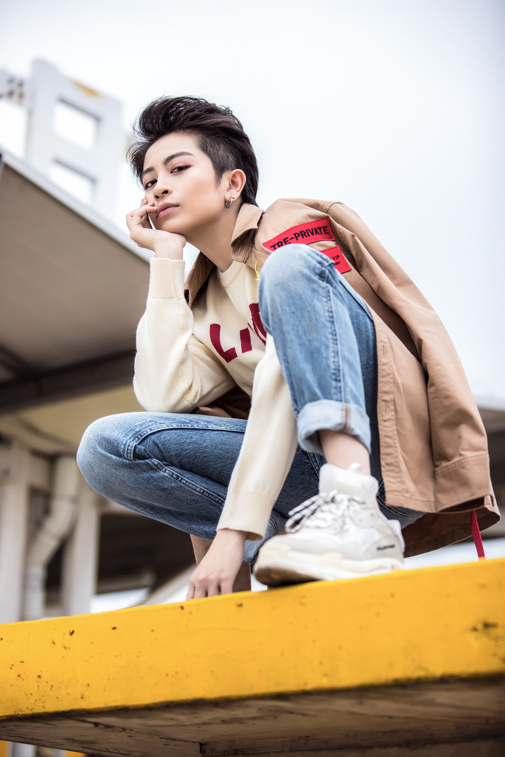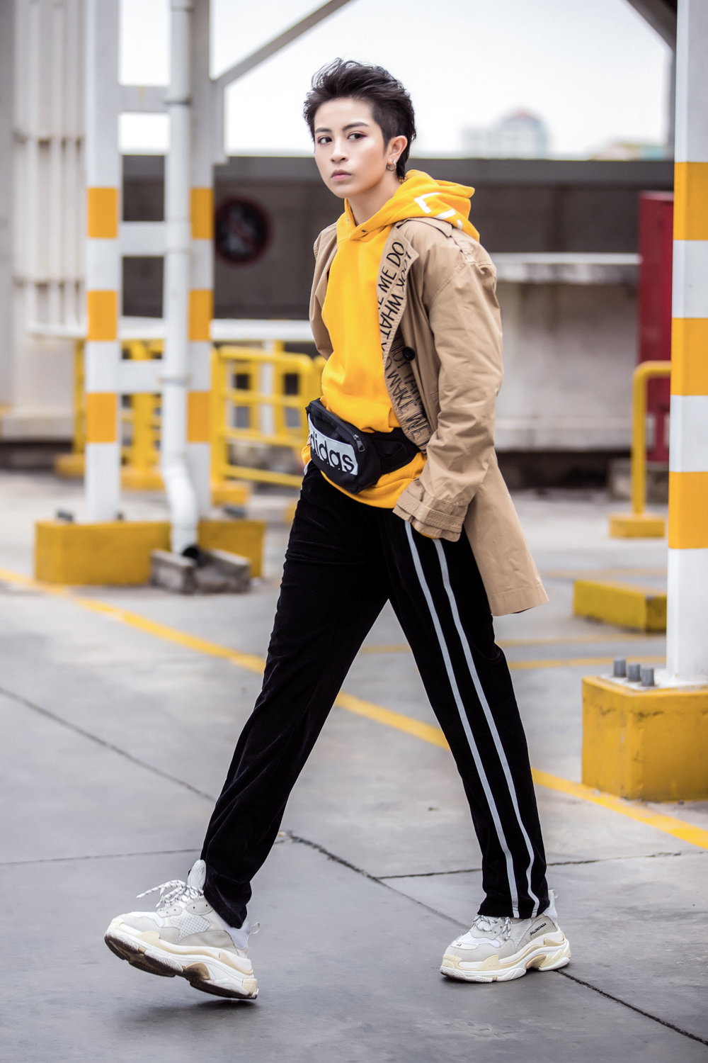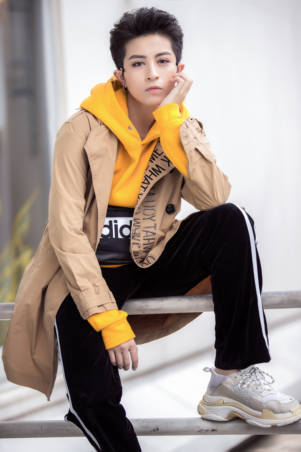Tại set tiếp theo, Gil diện áo Hoodie vàng nghệ, bên ngoài khoác áo măng-tô màu nâu nhạt với điểm nhấn họa tiết nơi cổ áo.