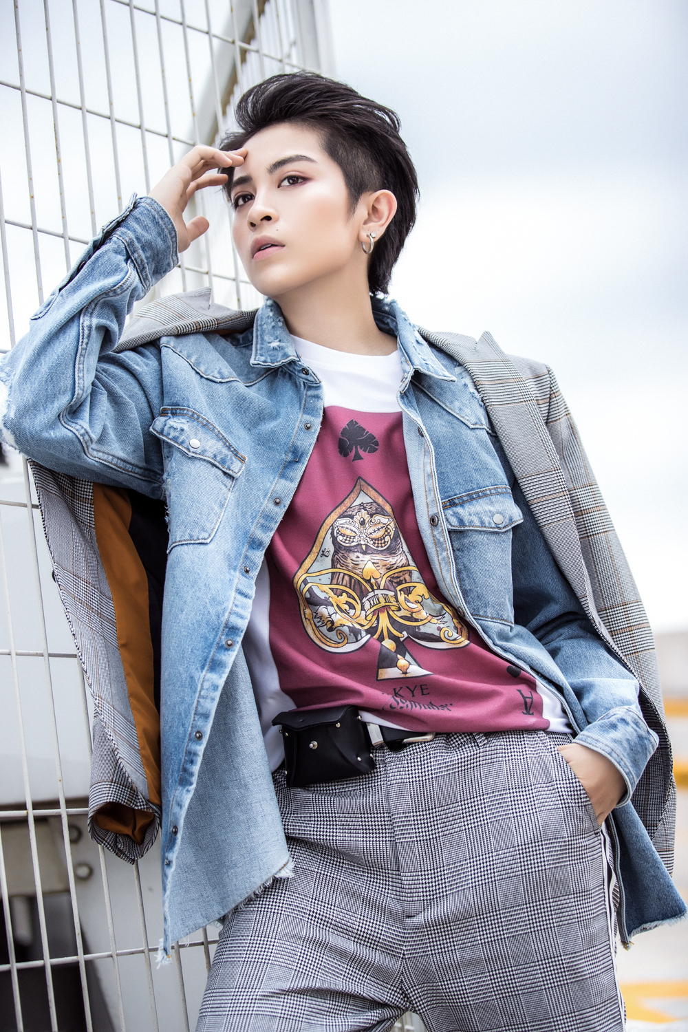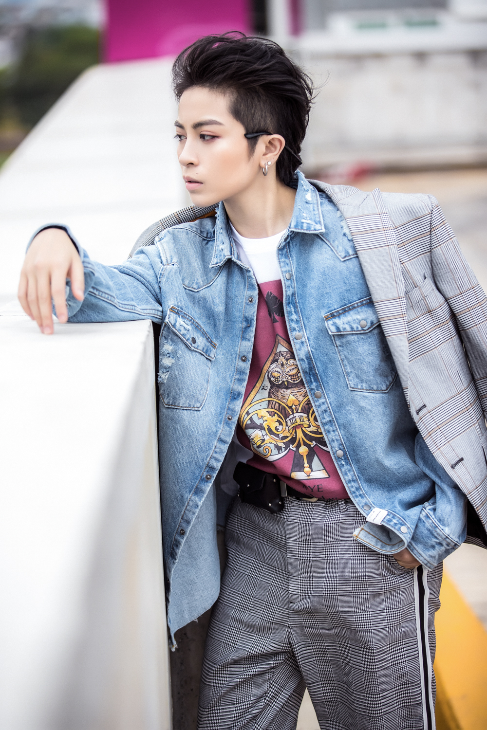 Suit ca-rô xám nhạt khoác bên ngoài áo jeans, áo t-shirt trắng họa tiết to bản ở trong là một sự kết hợp khá lạ mắt mà Gil mang đến.