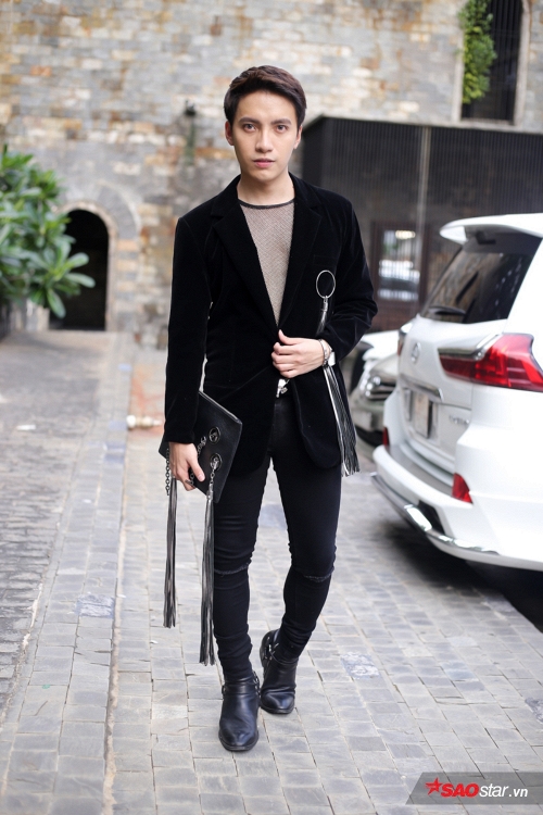 Stylist Kye Nguyễn diện áo lưới phá cách trên tổng thể gam đen cá tính với điểm nhấn đến từ chiếc clutch đính kết tua rua cùng mẫu khuyên tròn độc đáo.
