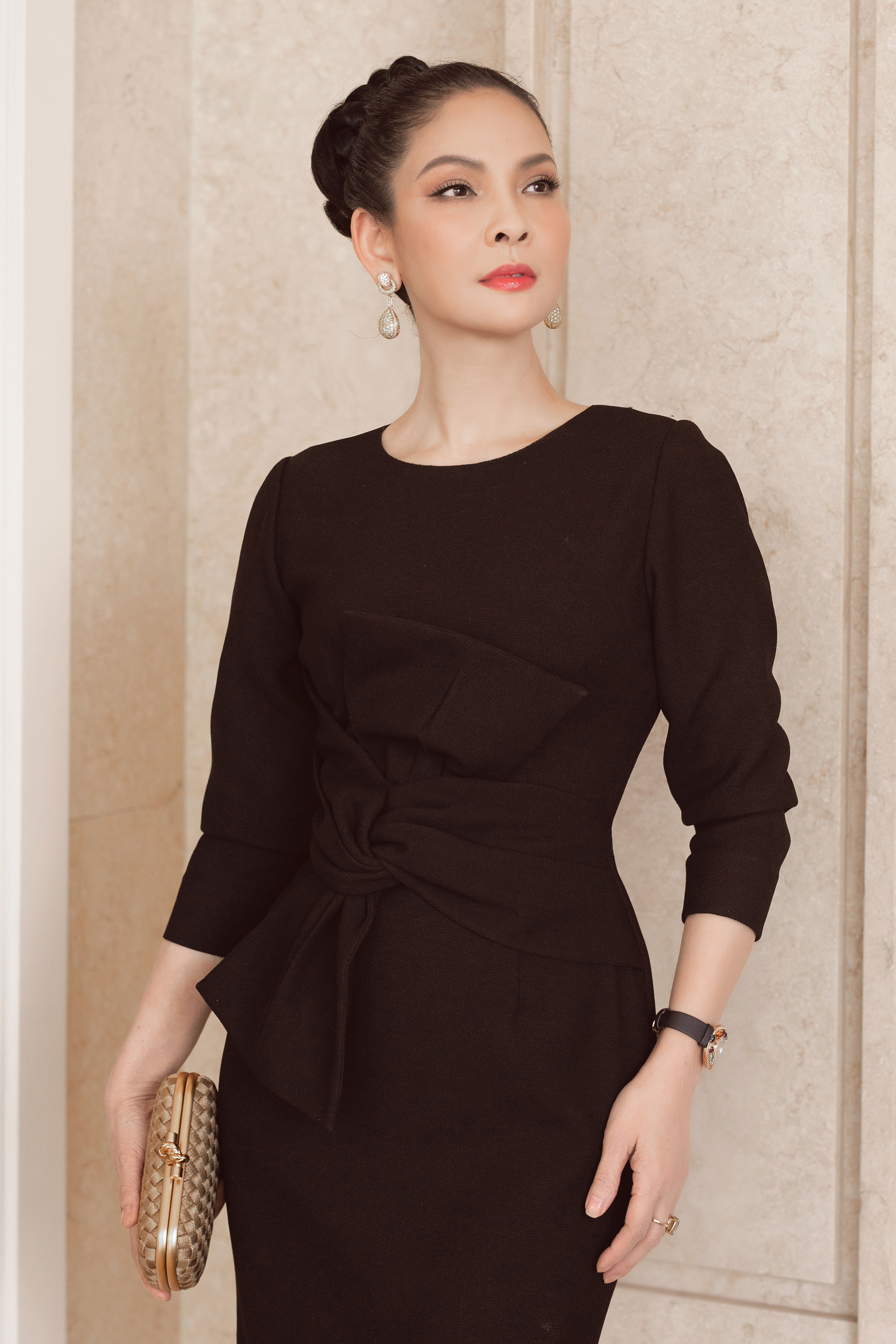 Thuỷ Hương lại trông khá giản dị với chiếc váy đen được tạo điểm nhấn bằng hoạ tiết nơ 3D to bản. Chị phối bộ váy với một số phụ kiện có màu ánh kim để nổi bật hơn.