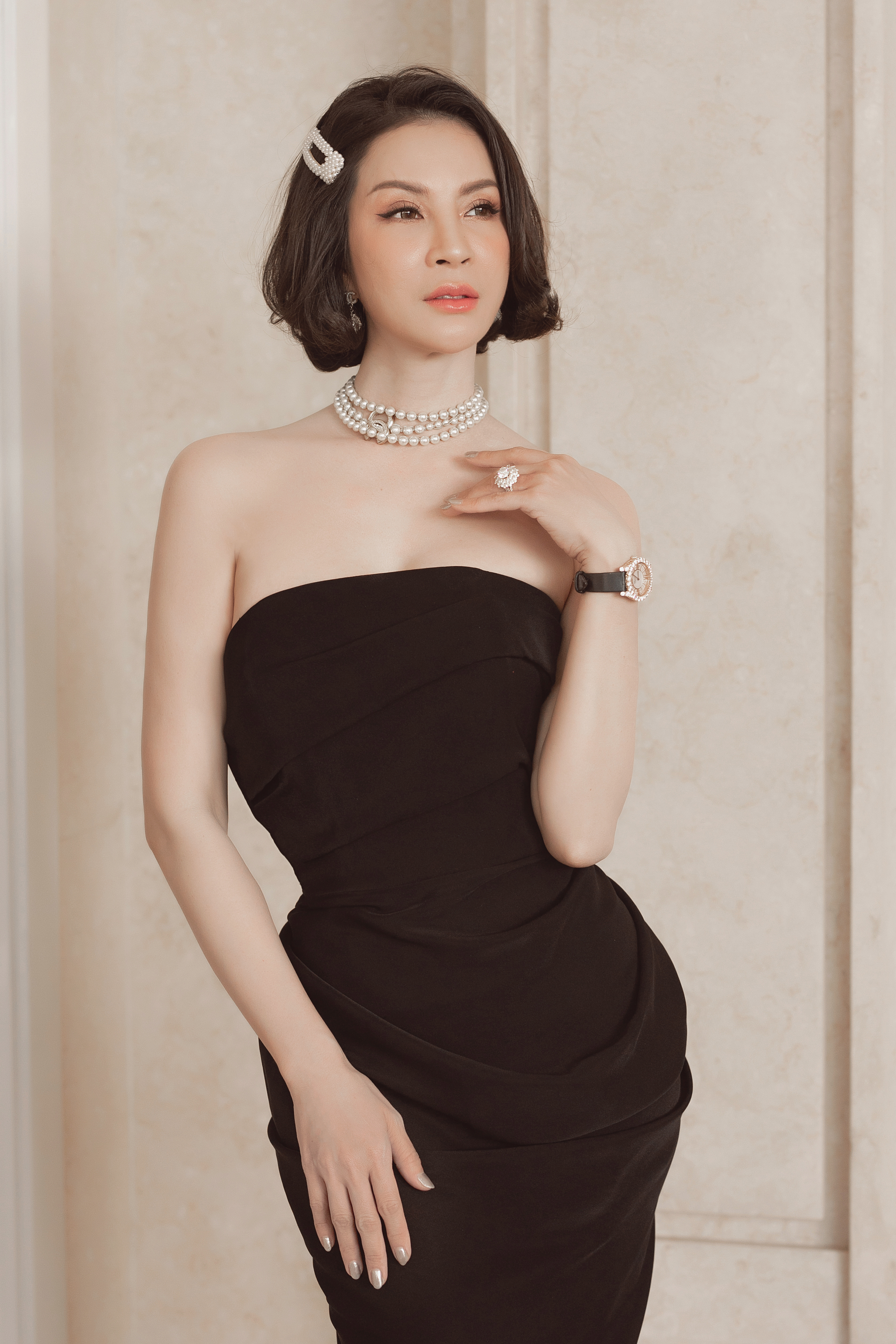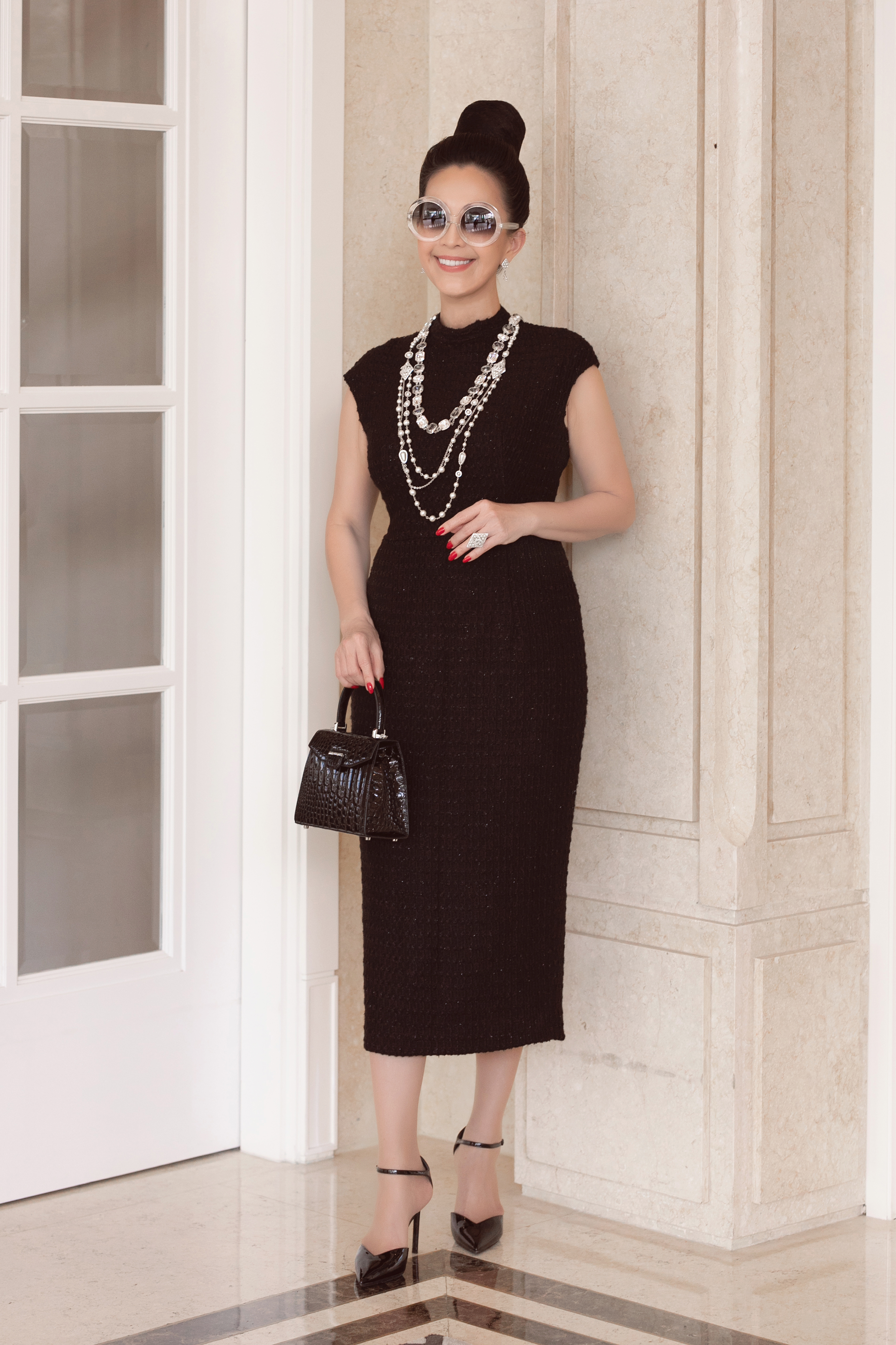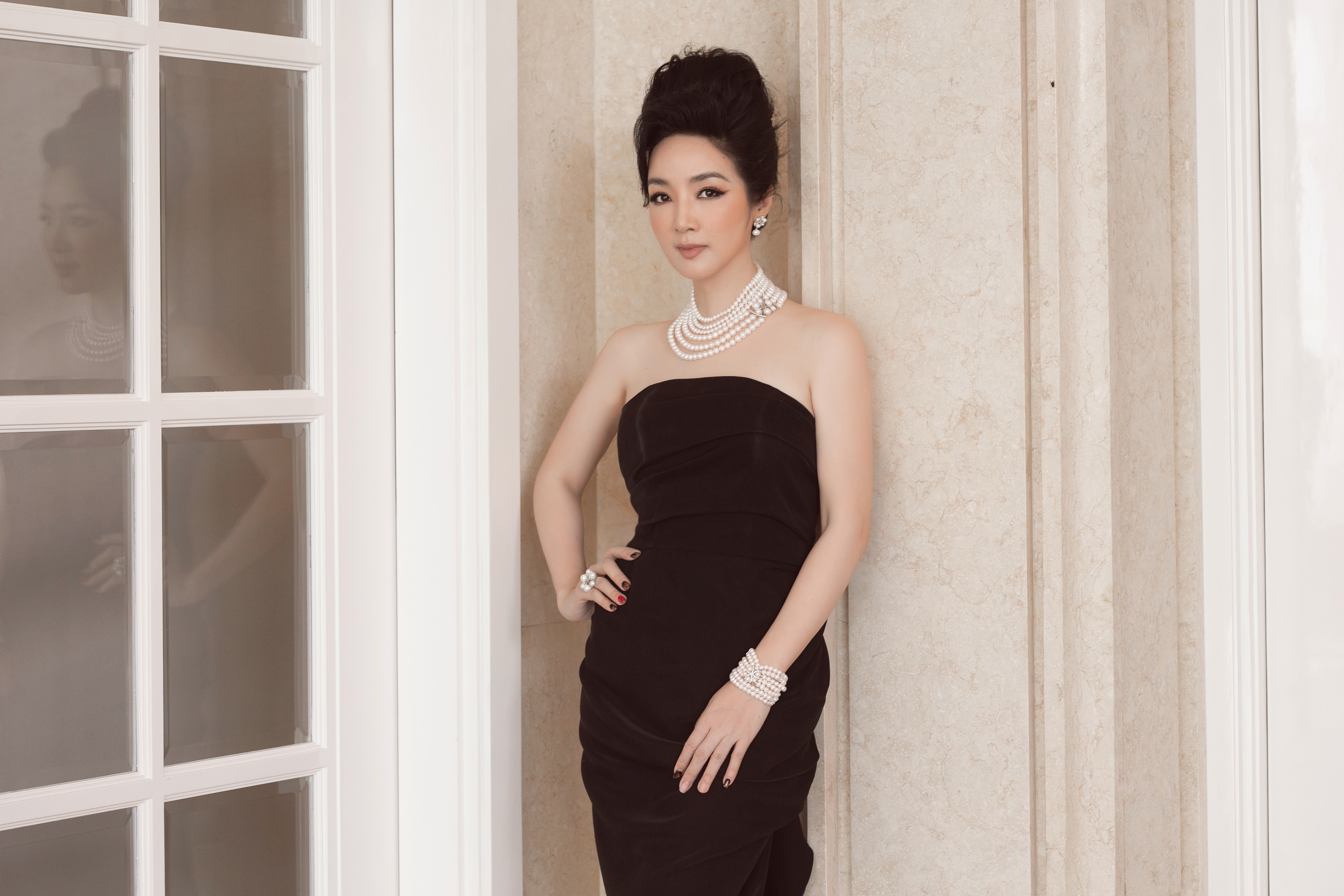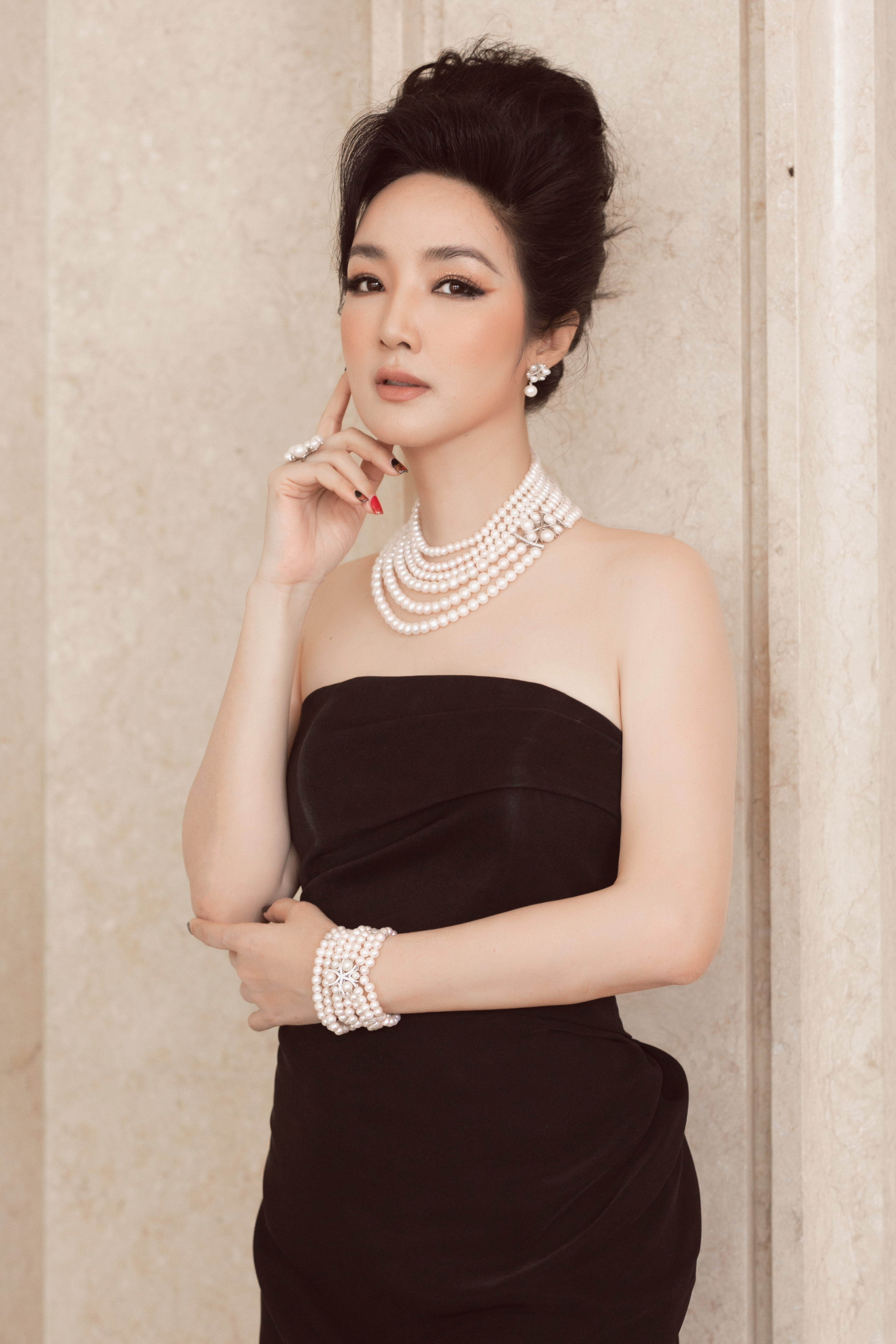 Diễn viên Diễm My tạo nên hình ảnh thanh lịch với chiếc váy ôm sát màu đen bằng chất liệu vải tweed thịnh hành trong mùa thời trang thu đông. Cô cũng rất chuộng trang sức ngọc trai, của nhà mốt Chanel.