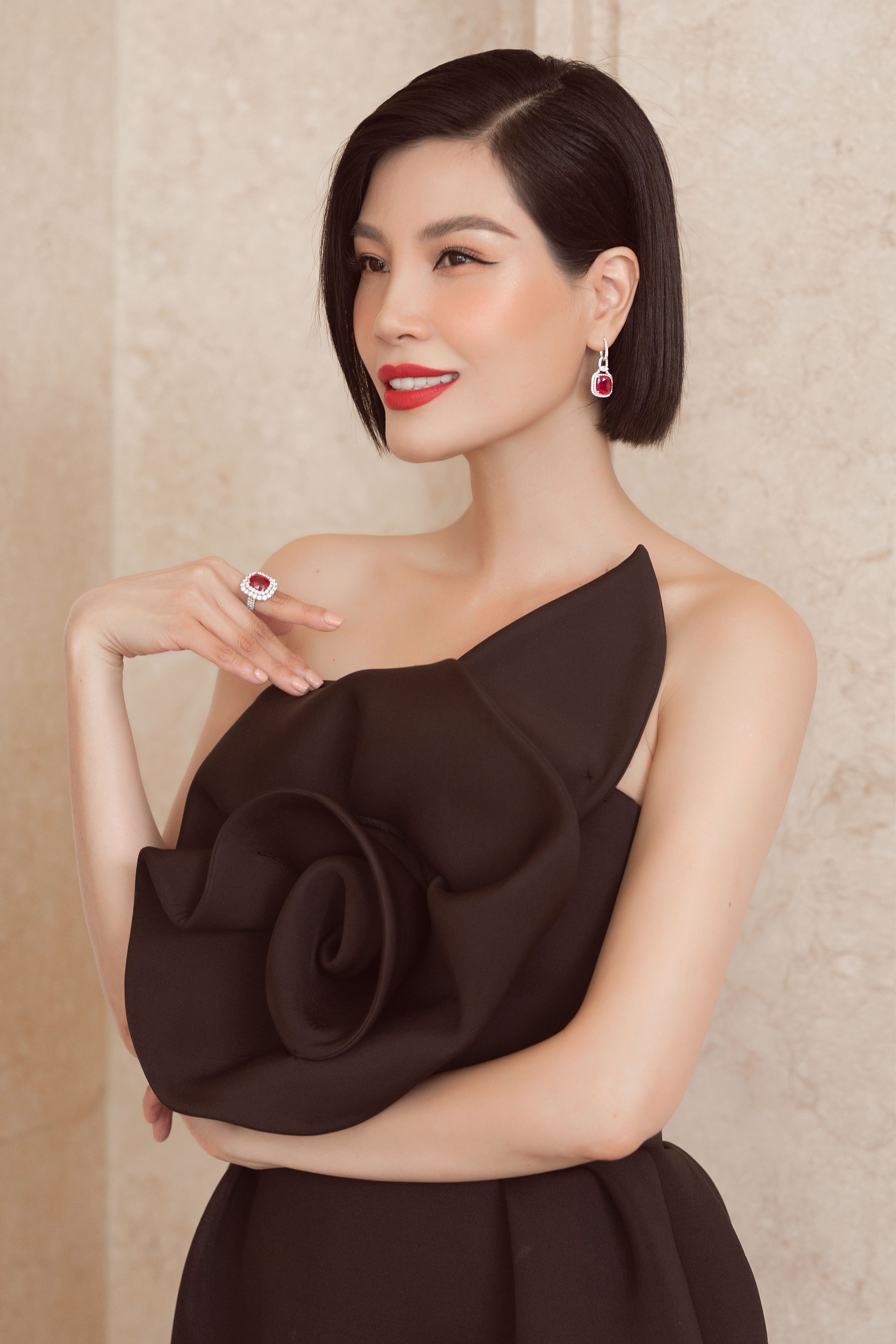 Vũ Cẩm Nhung chọn thiết kế với hoạ tiết hoa hồng 3D to bản làm điểm nhấn, phối cùng một số phụ kiện nhỏ, đơn giản.