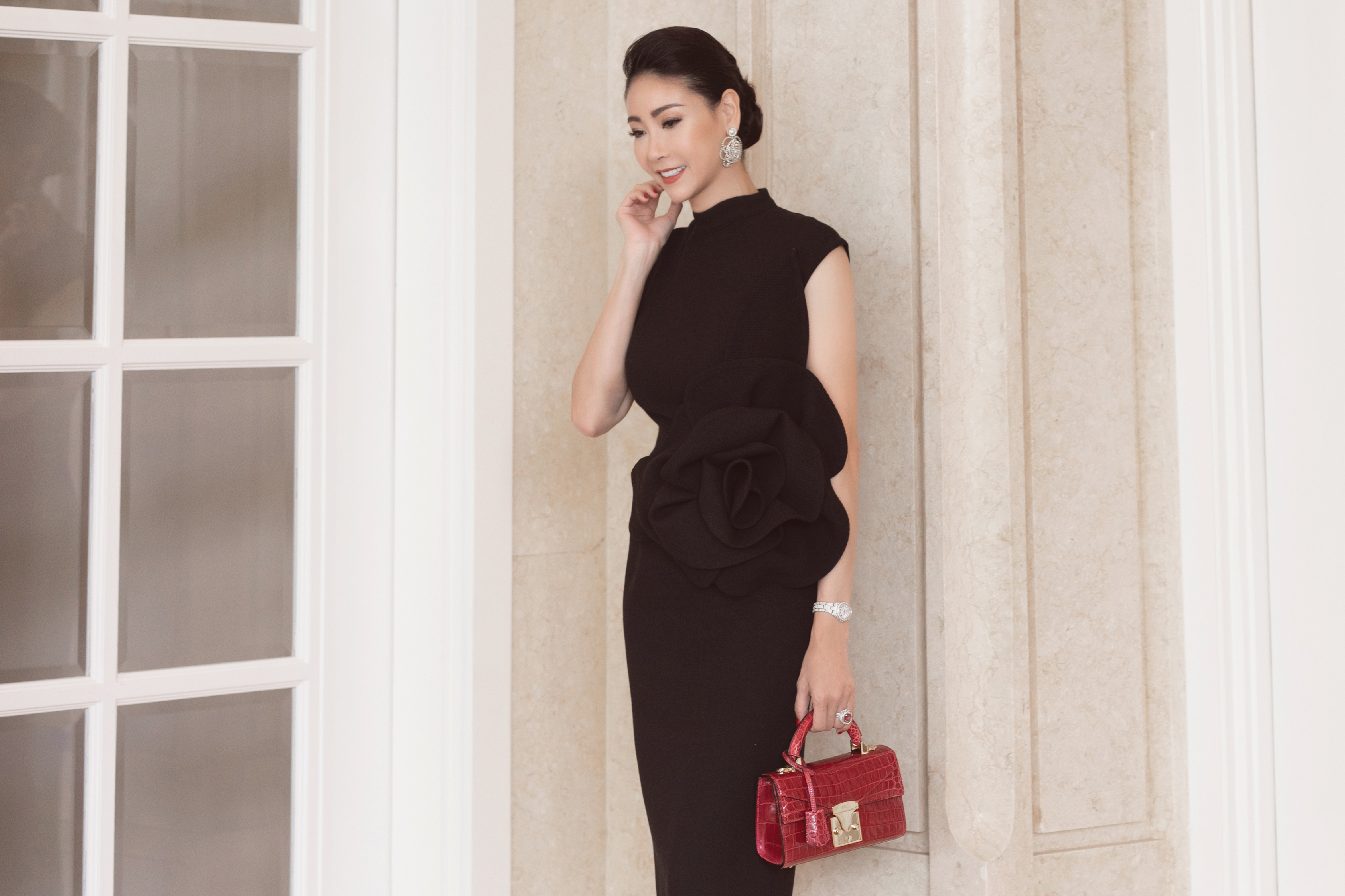 Hoa hậu Hà Kiều Anh sang trọng với mẫu đầm bodycon có hoạ tiết hoa to ở thắt eo. Chị mang túi da cá sấu màu đỏ bắt mắt và hoa tai to bản.