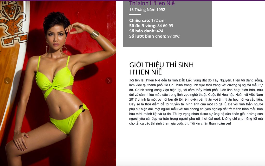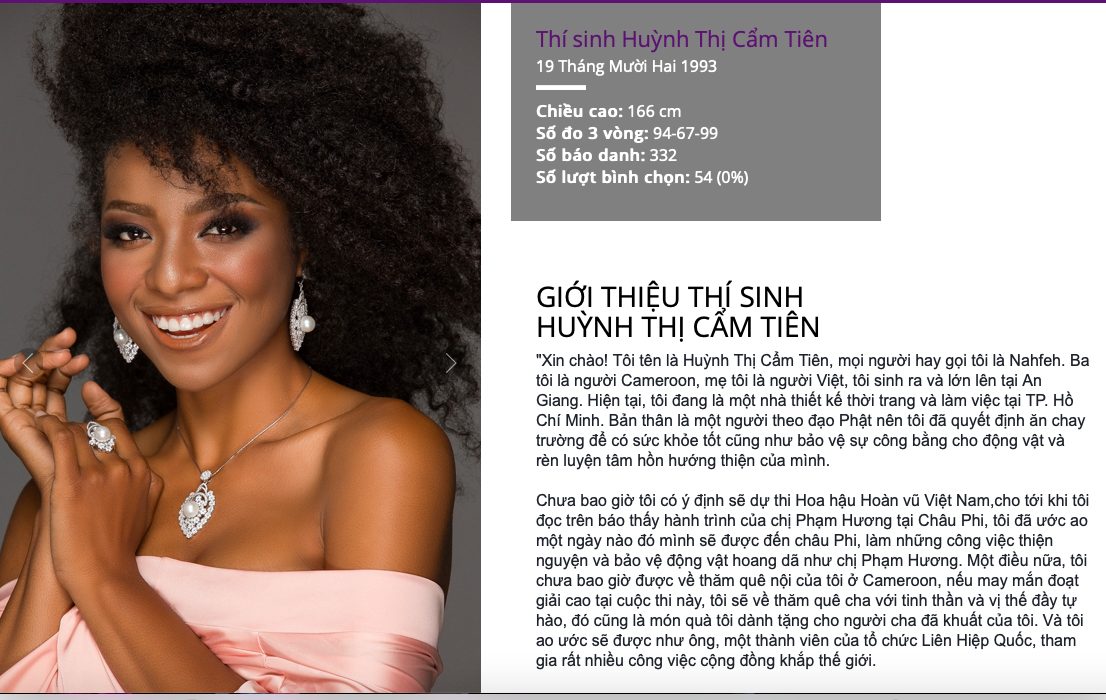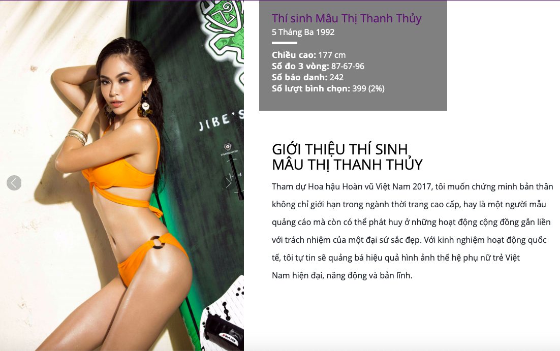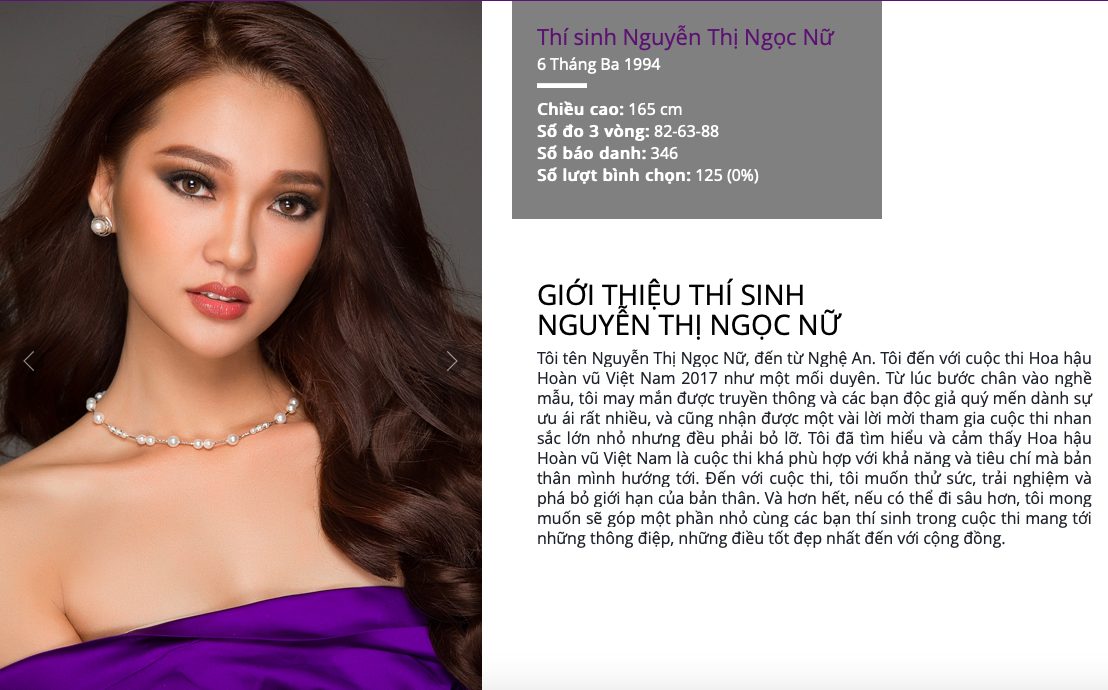 Sau đó trong phần giới thiệu cá nhân trên trang chính thức của Hoa hậu Hoàn vũ Việt Nam cho biết cô chỉ cao 1m65, số đo 3 vòng là 82-63-88, cm.