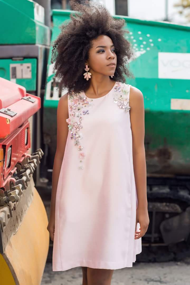 Mái tóc xù, đầm suông hồng kế hợp hoa tai bản lớn, vừa cá tính nhưng không làm mất đi nét nữ tính của cô gái người Việt gốc Phi.