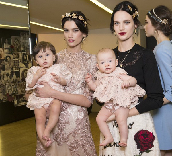 Trước đây, trong show của Dolce & Gabbana 2015, nhiều người mẫu cũng bế theo con nhỏ khi trình diễn. Tại Việt Nam, cũng có rất nhiều bà mẹ bế con cùng đi catwalk điển hình là show của NTK Thủy Nguyễn, người mẫu Lâm Thu Hằng xuất hiện cùng cậu con trai đầu lòng 4 tháng tuổi khiến cả khán phòng đều đứng lên tán thưởng.