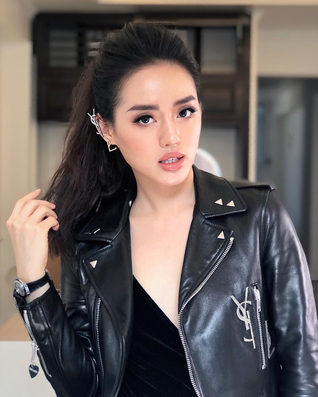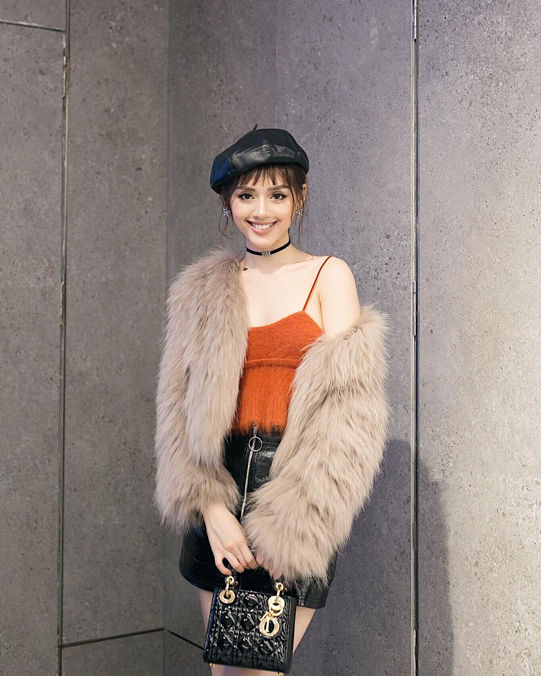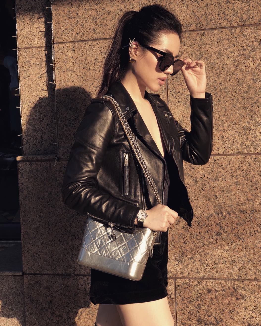 Khác với phong cách tiểu thư, “bánh bèo” thường lệ, lần này nàng mẫu sinh năm 1995 phối túi đi cùng với áo khoác da cực ngầu.