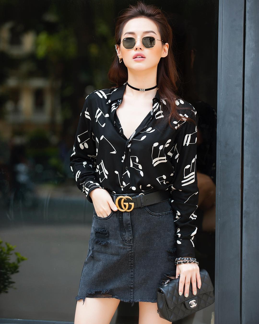 Chiếc thắt lưng Gucci này có giá trên dưới 20 triệu đồng được cô phối với nhiều set đồ khác nhau.
